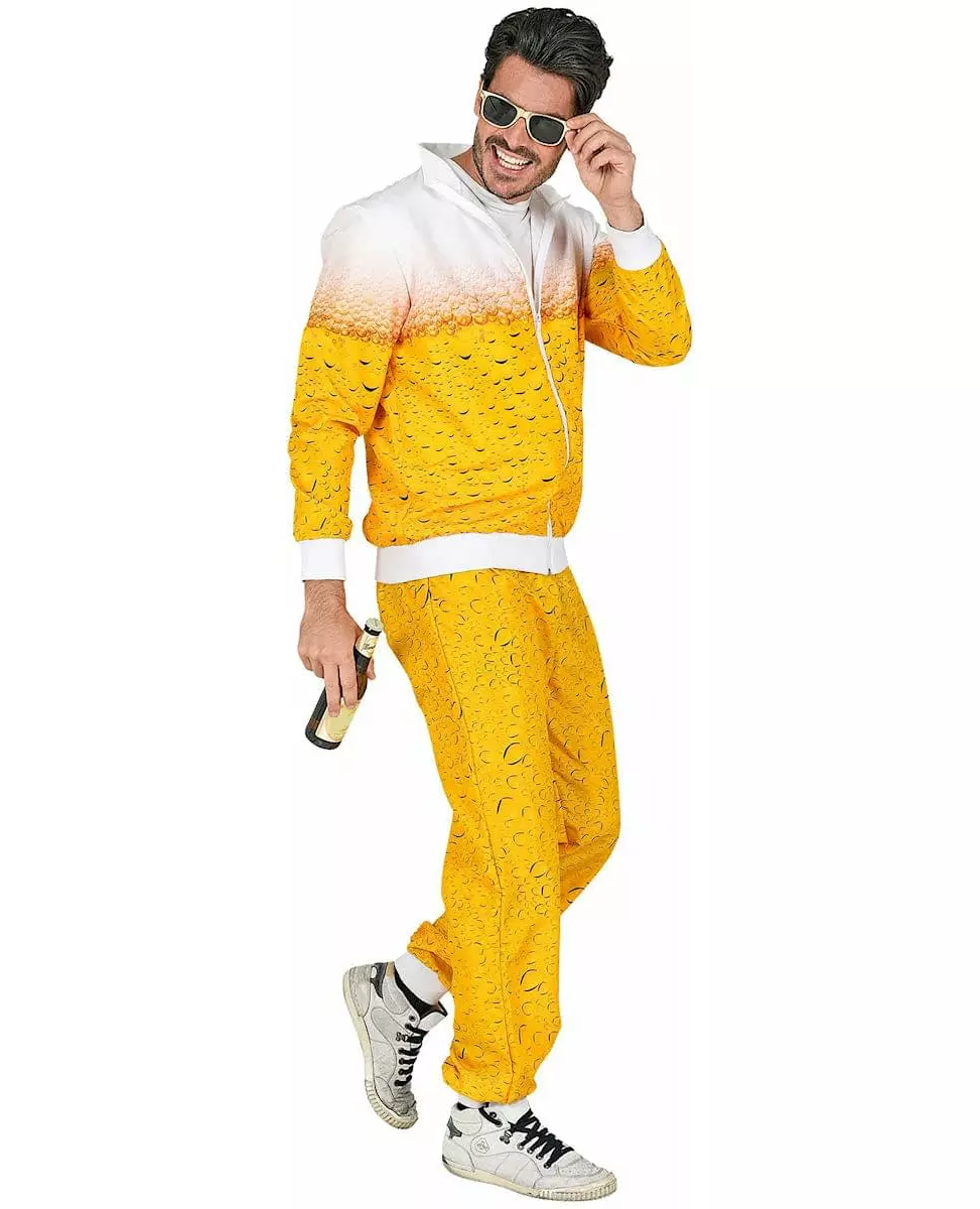 Cheers! This beer tracksuit costume is for adults. It consists of a jacket and pants. The top of the outfit is a tracksuit jacket with a white zipper down the middle. The jacket features a yellow and white gradient. The pants, also tracksuit pants, are yellow. The entire costume has a "beer drop" effect printed directly on the top and bottom. Go unnoticed at the famous Oktoberfest or for a themed evening! Accessories included: Jacket Pants Material: 100% Polyester Care: Hand wash
