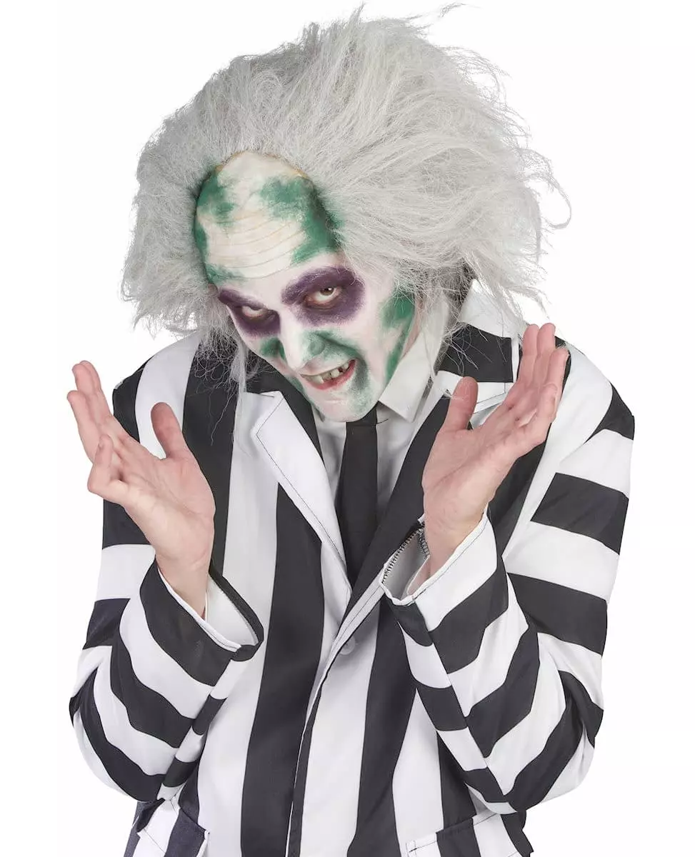 Scary! This Beetlejuice™ wig for adults is officially licensed. The wig is made of synthetic hair. It consists of a fake latex skull on the front. This wig is similar to the hairstyle of this famous eponymous character from Tim Burton's film. This Beetlejuice™ wig is perfect to complete your Beetlejuice™ costume and embody this legendary character during Halloween or a theme party. Accessories included: Wig Material: Latex and synthetic Care: Hand wash in cold water