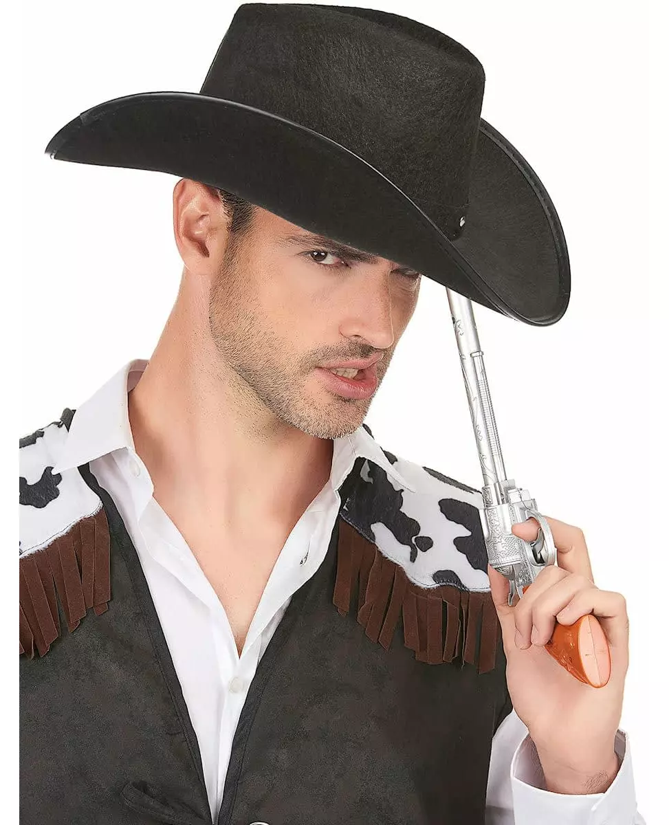 A little break at the Saloon? This hat is for adults. Made entirely of black felt, it features a black border with silver metal details. The headgear fits a head circumference of 61 cm. Create the perfect cowboy outfit with this essential hat!. Accessories included: Hat Material: 100% polyester Care: Hand wash