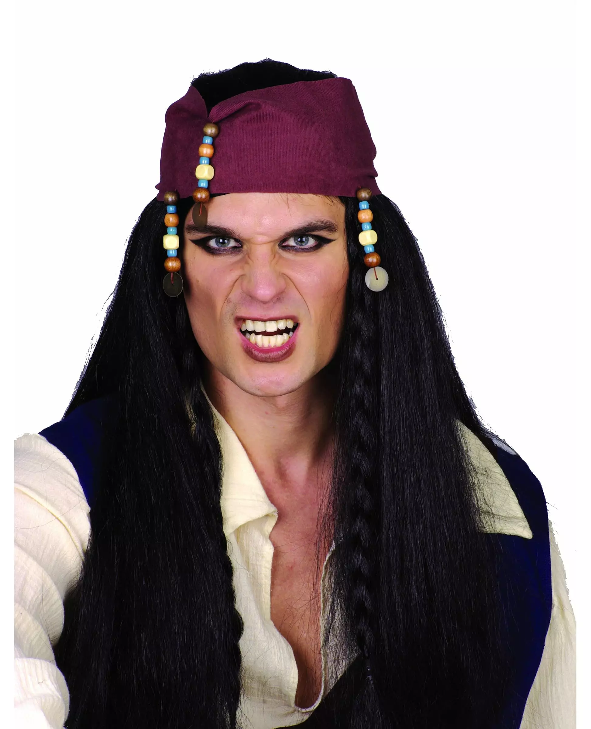 Become a bloodthirsty pirate for the carnival This pirate wig for adults has long black hair. Two braids are present on either side of the face. A brown headband decorated with colorful beads accessorizes the wig. This wig will be perfect to complete a pirate costume for a costume party with friends. Accessories included: Wig Material: Synthetic 100% Polyester 100% Polyester