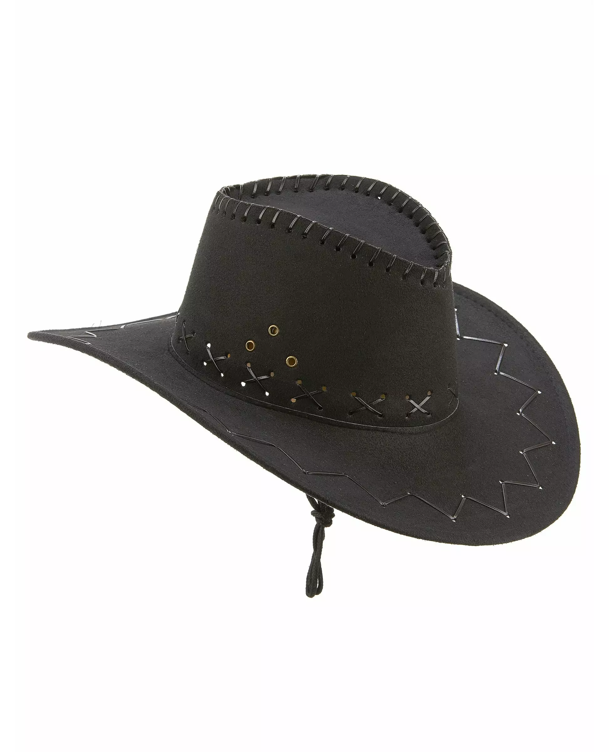 All to the Wild West! This superb cowboy hat is for adults. Black in color, its very soft feel evokes that of suede leather. Faux leather lacing crisscrosses the hat, and a flexible string will allow you to wear your hat on your back like a real cowboy! Suitable for head circumferences close to approximately 59 cm, it will be ideal to complete a Wild West king costume!. Accessories included: Hat Material: Polyester