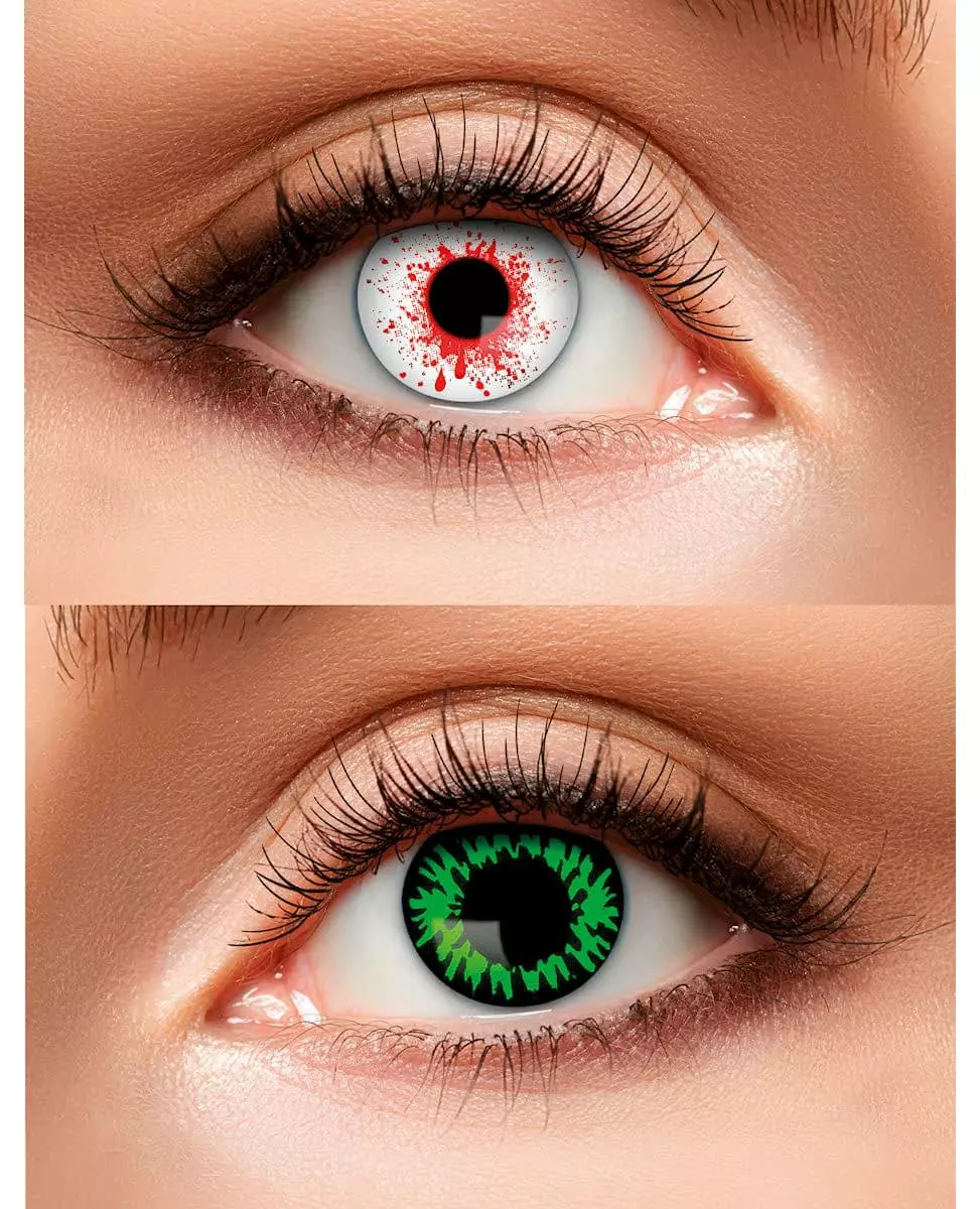Transform your look for Halloween! These duo lenses are for adults. You will receive one green and black lens and one white and red lens. They can be used for 3 months after opening. These lenses will add the finishing touch to your Halloween costume! Accessories included: 2 lenses Care instructions: Included in the packaging