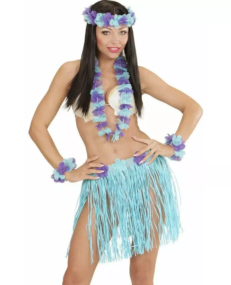 Head to the islands with this Hawaiian kit! This blue and purple Hawaiian kit for adults consists of a necklace, a crown, two bracelets, and a skirt (bra not included). The necklace, bracelets, and crown are decorated with fine fabric flowers. These flowers are sky blue and purple. All of these accessories are elastic for easy wear. The short skirt is made of blue raffia. Blue and purple flowers adorn the top of the skirt. This skirt measures approximately 40 cm in length. It has an elastic waistband and closes easily with a Velcro fastener. This Hawaiian kit will be perfect to complete your vahé outfit. for a tropical-themed evening. © Copyright Widmann SRL. Accessories included: Crown Necklace 2 Bracelets Skirt Material: 100% Polyester 100% Polyester