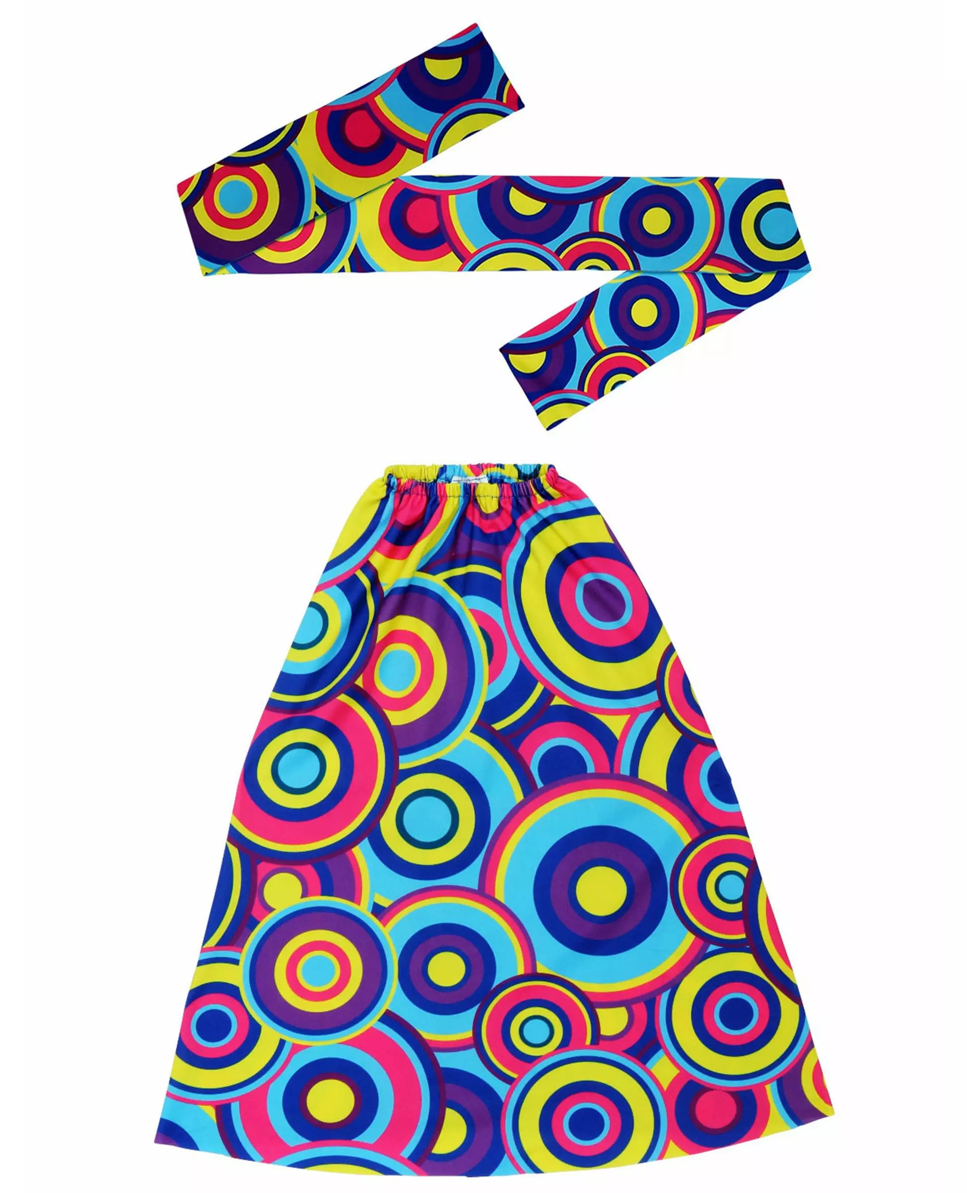 Add some color to your disco costume with this kit This retro kit for women consists of a headband and a pair of leg warmers (only these items are included). The set is made of a fabric in shades of blue and pink, which represent psychedelic bubbles. The headband simply ties around the head. The leg warmers are elastic and slightly flared. This kit will be perfect to complete a disco costume for Carnival or a party. Retro theme.. Accessories included: Headband 2 Leg warmers Material: 100% Polyester