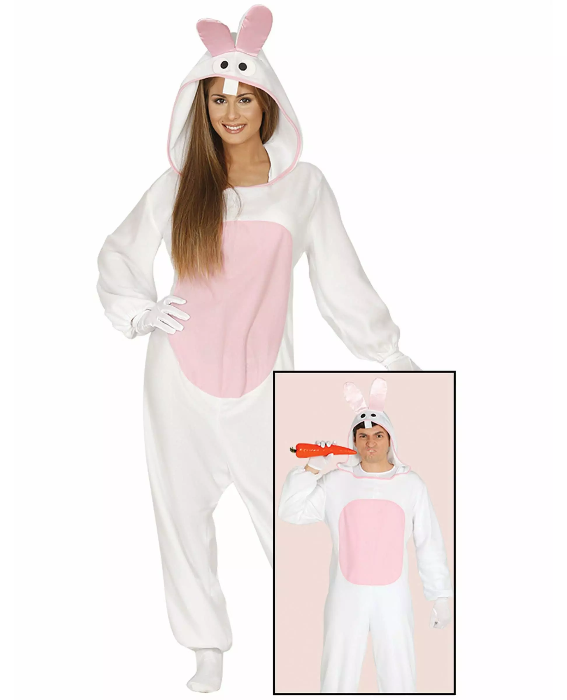 Bwa Bwa! This rabbit costume is for adults. It consists of a jumpsuit that represents a white rabbit with a pink belly. This jumpsuit has a hood with the face of a rabbit with big ears, bewildered eyes and two big teeth. This rabbit costume will be perfect for carnival or for an animal-themed party. Accessories included: Jumpsuit with hood Material: 100% polyester Care: Hand wash