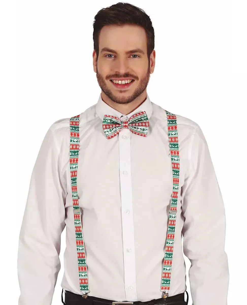 In the theme for Christmas! These Christmas-themed suspenders are for adults. They are red and green, featuring Christmas motifs such as snowflakes and Christmas reindeer. You can easily adjust them and then secure them with metal clips located at the front and back. Complete your Christmas outfit with this pretty pair of suspenders for your Christmas Eve or New Year! Accessories included: 1 pair of suspenders Material: Polyester, plastic, metal Care: Hand wash