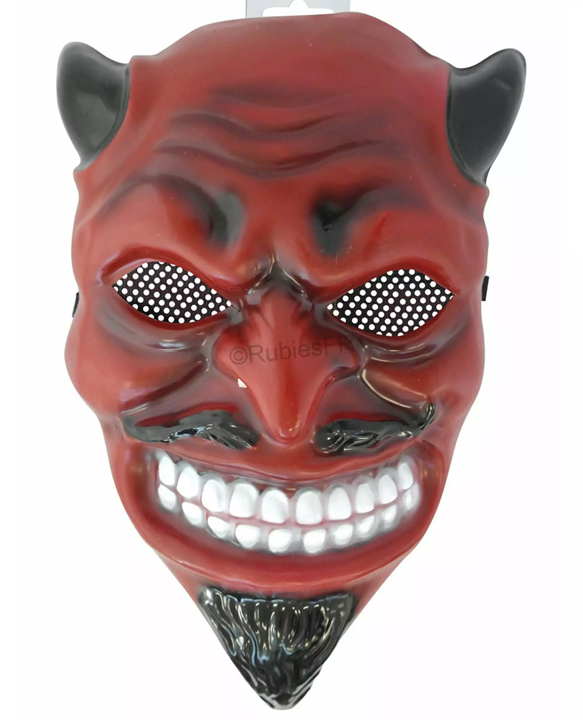 Lucifer better watch out for Halloween This devil mask is for adults. It represents the face of a red devil, with black horns and a wide smile. A net is present at eye level to allow you to see easily. This mask will be perfect to complete your devil costume on Halloween night. Accessories included: Mask Material: PVC