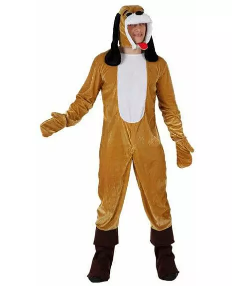 very soft dog! This adult dog costume consists of a hood, a jumpsuit with boot covers, and mittens (shoes not included). The brown and white imitation velvet outfit consists of a hood with a fleece-lined muzzle. The jumpsuit has elastic felt boot covers to stay on your feet. The mittens fold over your hands. This outfit fastens with Velcro on the back and is very comfortable. This adult costume, which has a bit of a dog in it, will be ideal for your animal-themed parties or for Carnival! Accessories included: Hood Jumpsuit with boot covers Mittens Material: 100% polyester Care: Hand wash