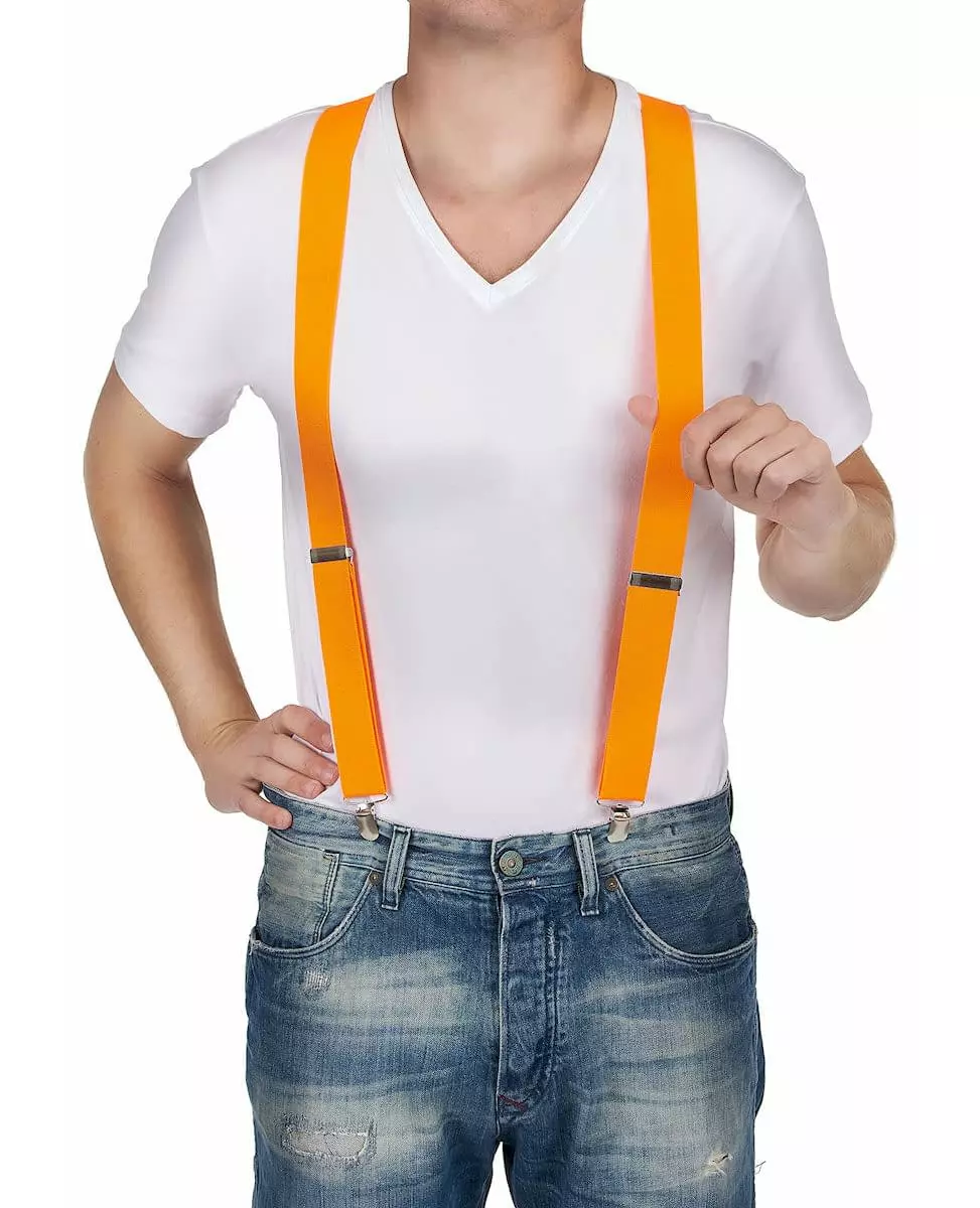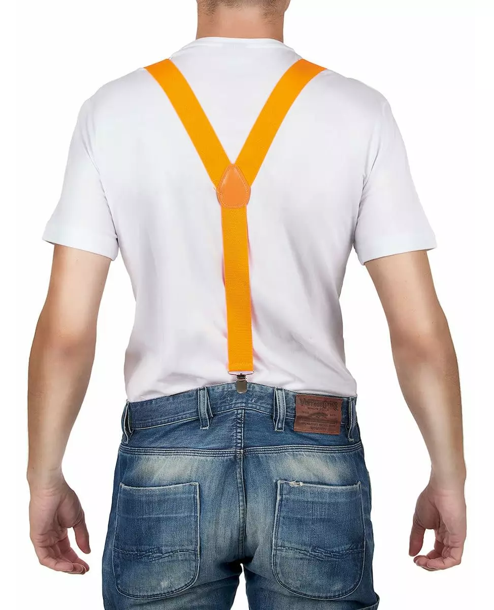 Classy in neon These pretty orange suspenders will attach easily thanks to metal clips. They will be ideal to complete your disguise during theme parties, for a show or any other festive and disguised event. Accessories included: Suspenders Material: Polyester