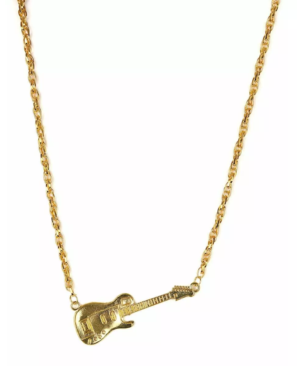 Become a rock star for an evening. This adult necklace features a gold electric guitar pendant. The metal chain is made of large links and is long enough to be worn around the neck without a clasp. Set the tone for the costume party by completing your costume with this accessory!. Accessories included: Necklace Material: Metal