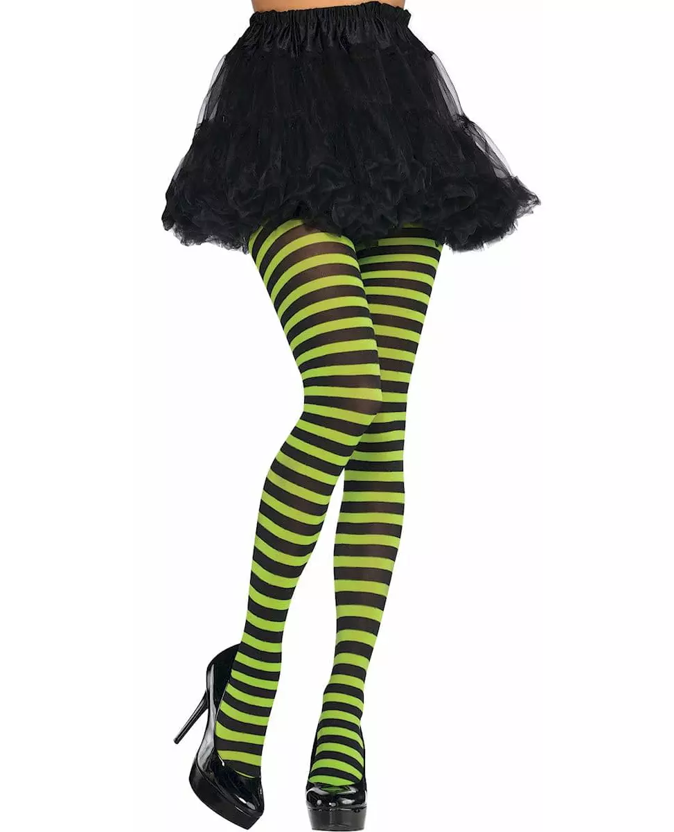 Disguise your legs! These adult tights are black and green, one size fits all. Made of polyester and nylon, they give a semi-opaque effect. The stripes are horizontal. Perfect to finish off your Halloween costume. Copyright Widmann SRL. Accessories included: Pair of tights Material: Polyester, Nylon
