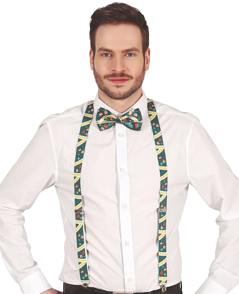 Be chic for your New Year's Eve party with friends! This pair of green Christmas suspenders are for adults. On a green background, they are decorated with golden garlands and Christmas motifs such as snowflakes and Christmas balls. Complete your Christmas outfit for your New Year's Eve! Accessories included: 1 pair of suspenders Material: Polyester, plastic, metal Care: Hand wash
