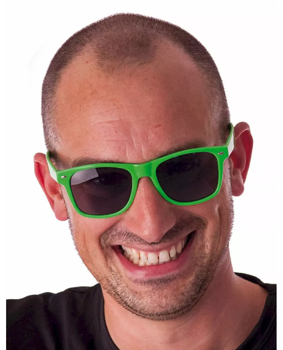 Dare to wear the neon look! These blue glasses are for adults. The plastic frame is neon green. They are filter category 3 and comply with EEC standards. This pair of sunglasses will be perfect to complete a retro costume during your fancy dress parties. Accessories included: Glasses