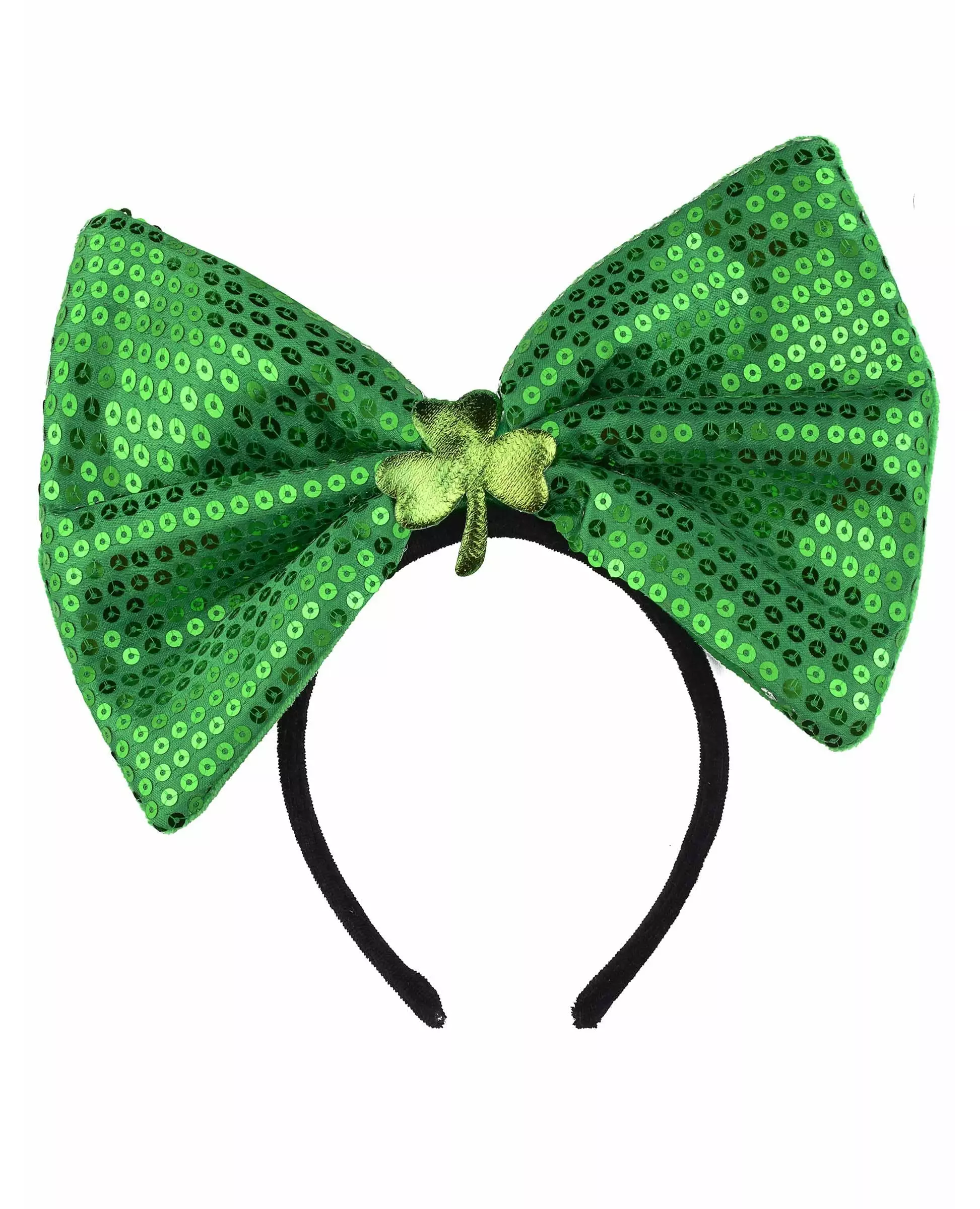 Happy St. Patrick's Day! This Saint Patrick's Day headband is for adults. It includes a soft headband covered in black fabric and topped with a large green bow with shiny sequins. The middle of the bow is decorated with a light green clover. To complete your Irish costume and make a statement on St. Patrick's Day, this headdress will be ideal!. Accessories included: Headband Material: 100% Polyester