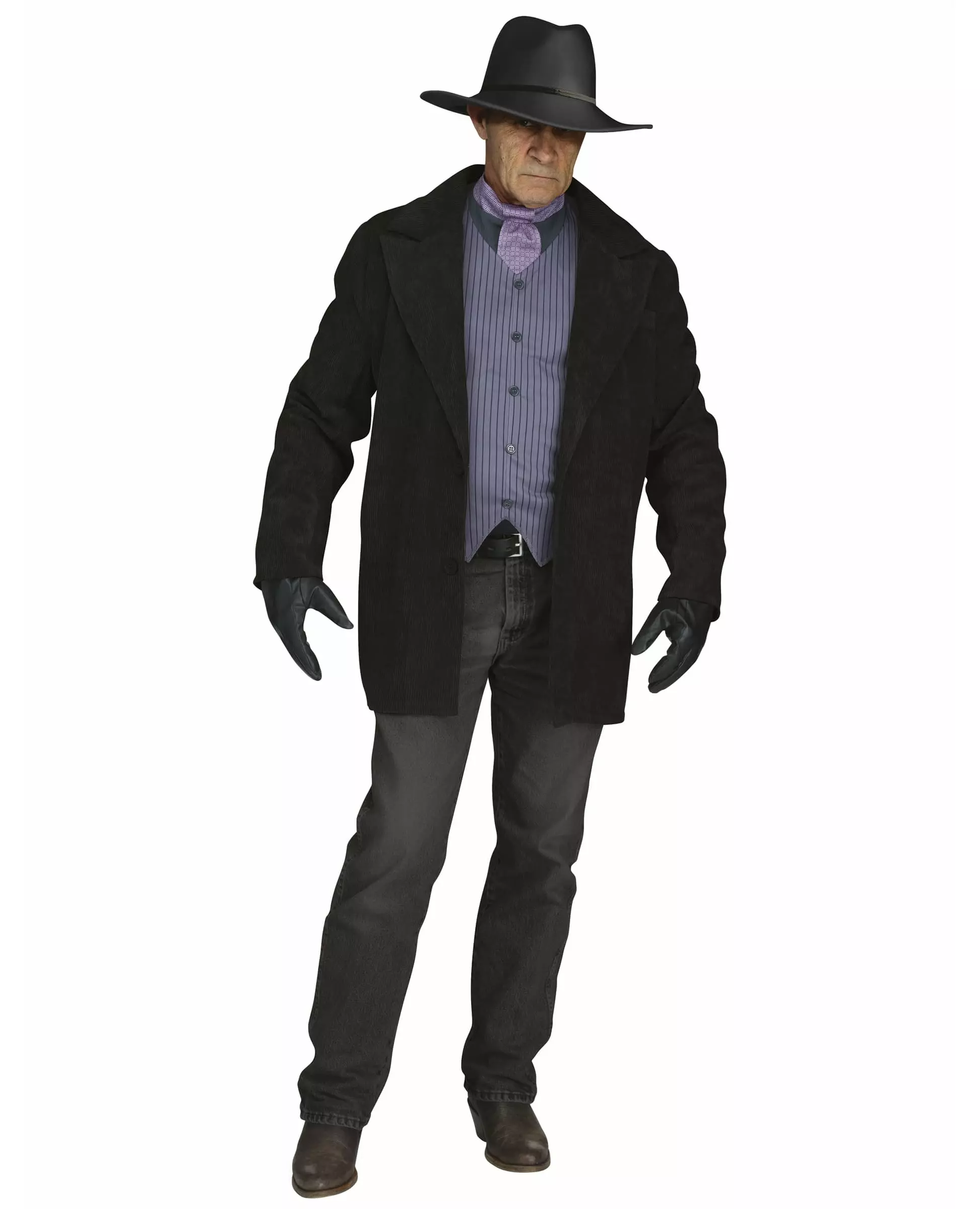 Become a gunslinger for one evening! This adult gunslinger costume consists of a jacket with a shirt, a pair of gloves, and a hat (pants, belt, and shoes not included). The jacket is long and straight. It is black with a velvet effect. The black shirt is sewn to the jacket. It is decorated with a fake purple vest with thin black stripes and a fake checkered tie. The hat is black with a darker border. You will complete the costume with the pair of black gloves. This gunslinger costume is ideal for a theme party! Accessories included - Jacket - Shirt with vest - Hat - Gloves