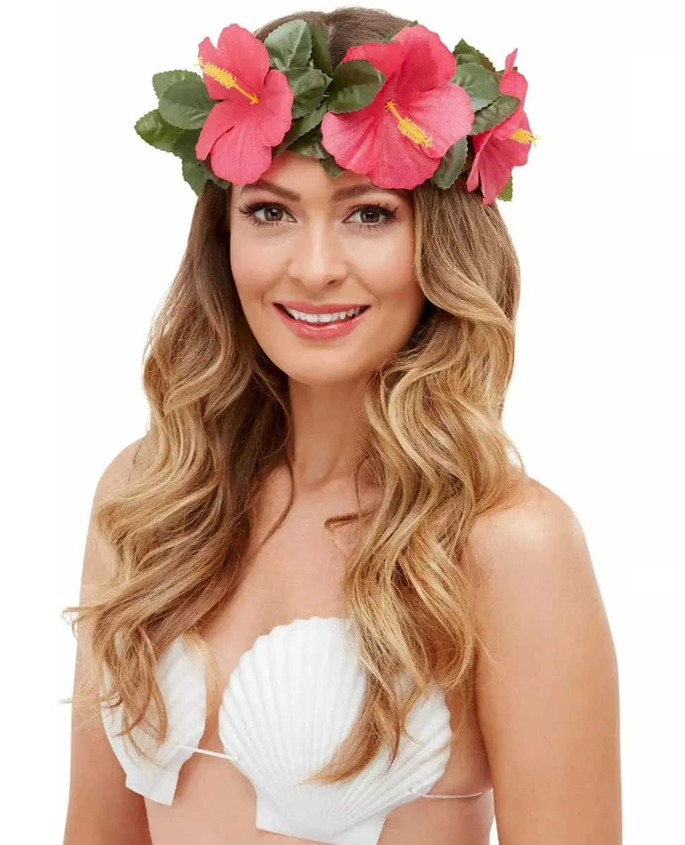 Become a real vahine with this accessory kit This Hawaiian accessory kit for adults consists of a headband and a pair of bracelets. The bracelets are decorated with fake green leaves. The elastic headband also comes with green leaves, with fake pink hibiscus flowers. This kit will be perfect to complete your vahine costume for a tropical evening. Accessories included: Headband 2 Bracelets Material: 90% Polyester, 10% Polypropylene