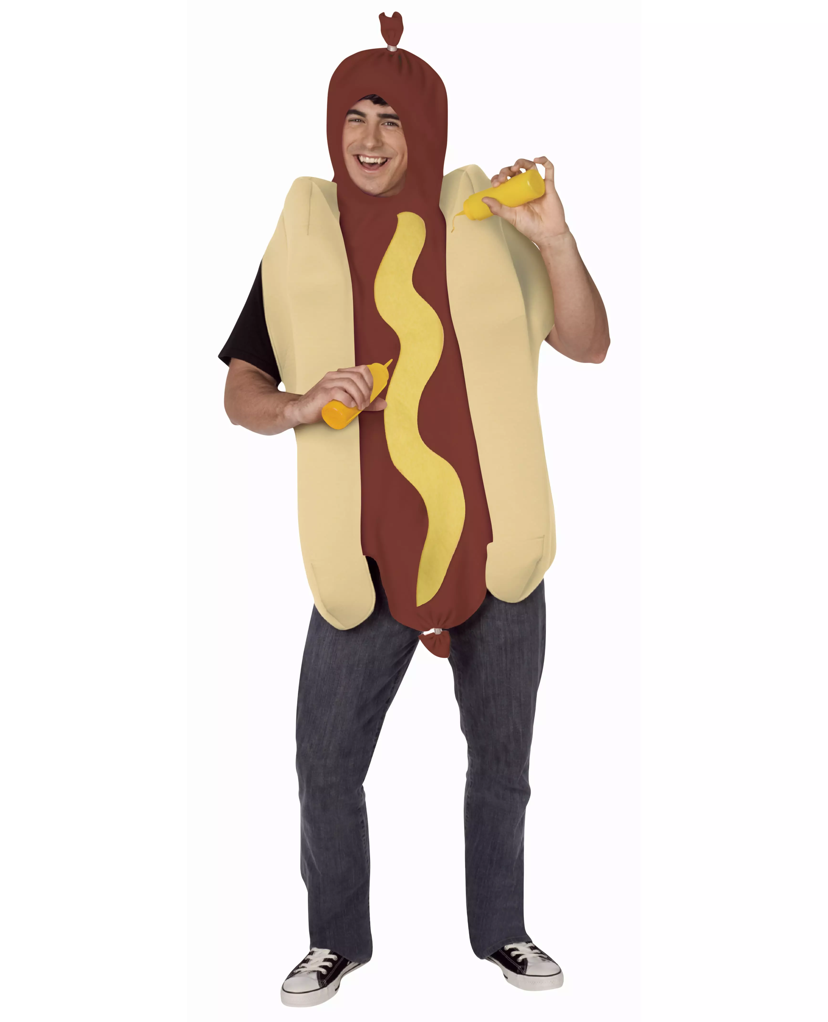 Yum yum! This adult hot dog costume is a jumpsuit (accessories not included). This jumpsuit will easily slip on over the head. The front is made of thick fabric for added rigidity. The bun is beige, the sausage garnet, and the mustard yellow. You can also stuff it for added effect. Our model, Jules, is 1m86 tall. This costume will be perfect for not going unnoticed and whetting your friends' appetites at a theme party or any other fancy dress occasion. Accessories included: Jumpsuit Material: 100% Polyester Care: Hand wash
