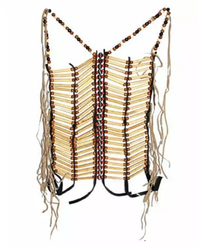 Embody an authentic Sioux chief! This adult Indian bustier has an open back. It is made of red, brown, and gray wooden beads. It attaches with strings that are hung around the neck and all around the waist. This bustier covers the front of the body and reaches above the navel. This accessory will be perfect for embodying an Indian chief at costume parties or any other festive event. Accessories included: Bustier