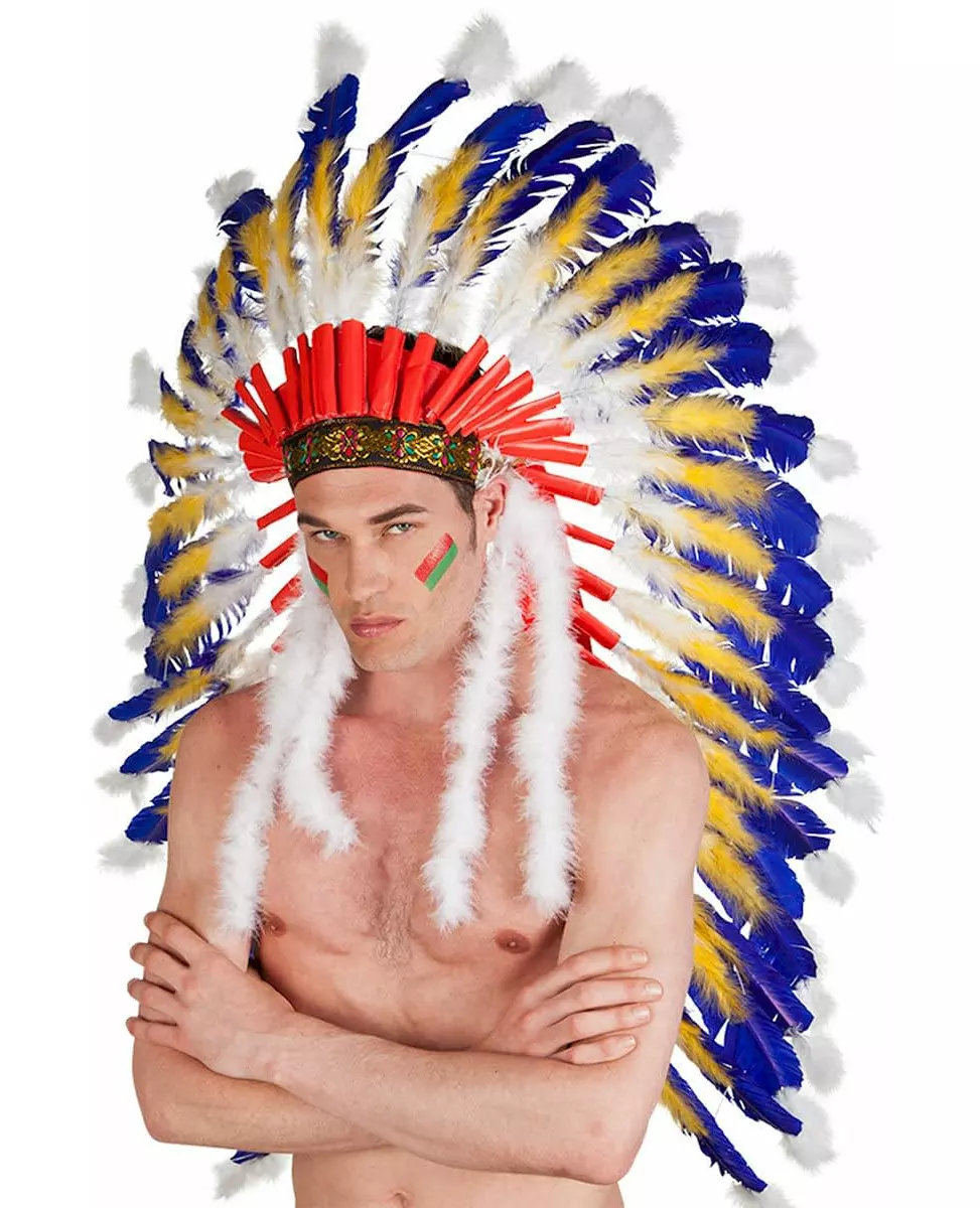 The wisdom of the ancestors lies in these feathers. This adult costume accessory is an Indian chief headdress. It sits on the head with a white elastic band. Black fabric is sewn onto the headband on the forehead. Gold flourishes adorn this headband. About forty white, blue, and yellow fake feathers are attached to red plastic supports. The headdress falls 50 cm down the back. White feather frills fall onto the shoulders. Play as a Sioux chief for a Wild West-themed costume party. Accessories included: Headdress Material: 60% Turkey feather, 34% Polyurethane, 6% Polyester 60% Turkey feather, 34% Polyurethane, 6% Polyester