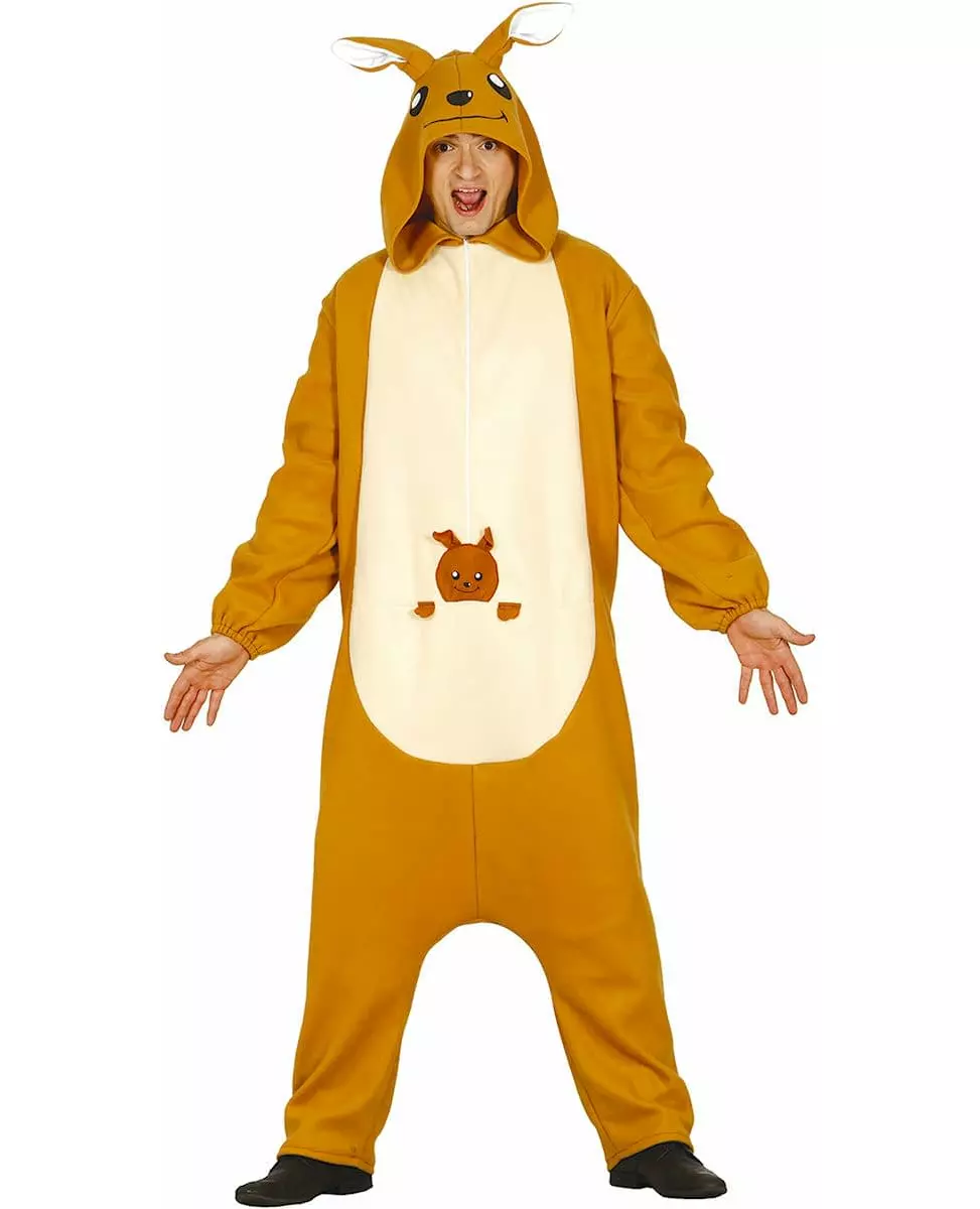 Boing! This kangaroo costume is for adults and consists of a hooded jumpsuit. The jumpsuit is made of an ochre-colored fabric, and the belly is beige, with a drawing of a baby kangaroo that seems to come out of an imaginary ventral pouch. The hood represents the head of a kangaroo with big ears. This costume will be perfect for transforming yourself into a kangaroo, on Carnival day or for an animal-themed costume party. Accessories included: Jumpsuit with hood Material: 100% polyester Care: Hand wash