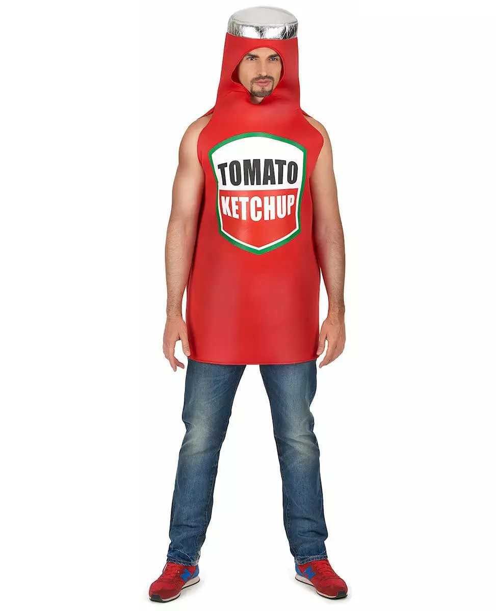 successful seasoning! This costume is for adults. To be put on like a jumpsuit, it is made of soft foam, which allows it to take on a rigid shape, that of a ketchup bottle! The head is adorned with a fake silver capsule and leaves the face entirely uncovered while the body is decorated with the "TOMATO KETCHUP" logo in black, white and red decorated with a green border. Available in one size, the costume is unisex. It measures approximately 110 cm long. Embody the famous ketchup bottle and go to looking for your fries at a fancy dress party! Accessories included: Jumpsuit Material: 100% polyester Care: Hand wash