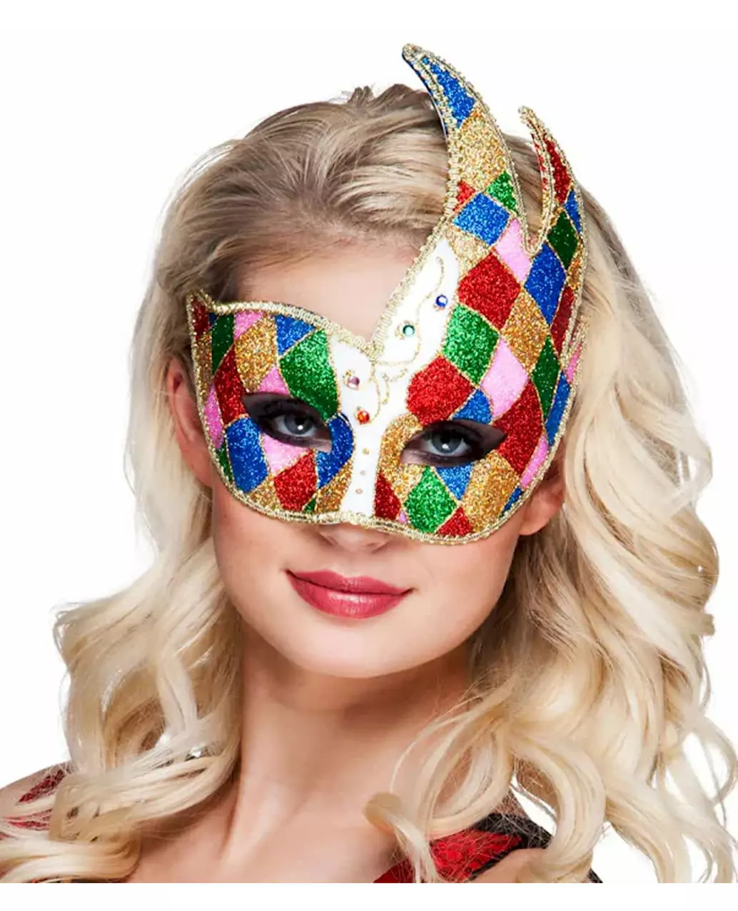 Ideal for the Carnival parade! This adult Venetian mask is made of rigid white plastic. It is decorated with blue, red, green, yellow and pink diamonds with sequins. The outline is adorned with a gold border. Blue, green, pink and red rhinestones are also present in the center of the mask. The mask measures approximately 16 cm wide and approximately 21 cm (to the tip of the highest point). It is held in place with a white elastic band. This Venetian mask will be ideal for participating in the famous Venice Carnival or a masked ball! Accessories included: 1 Mask,