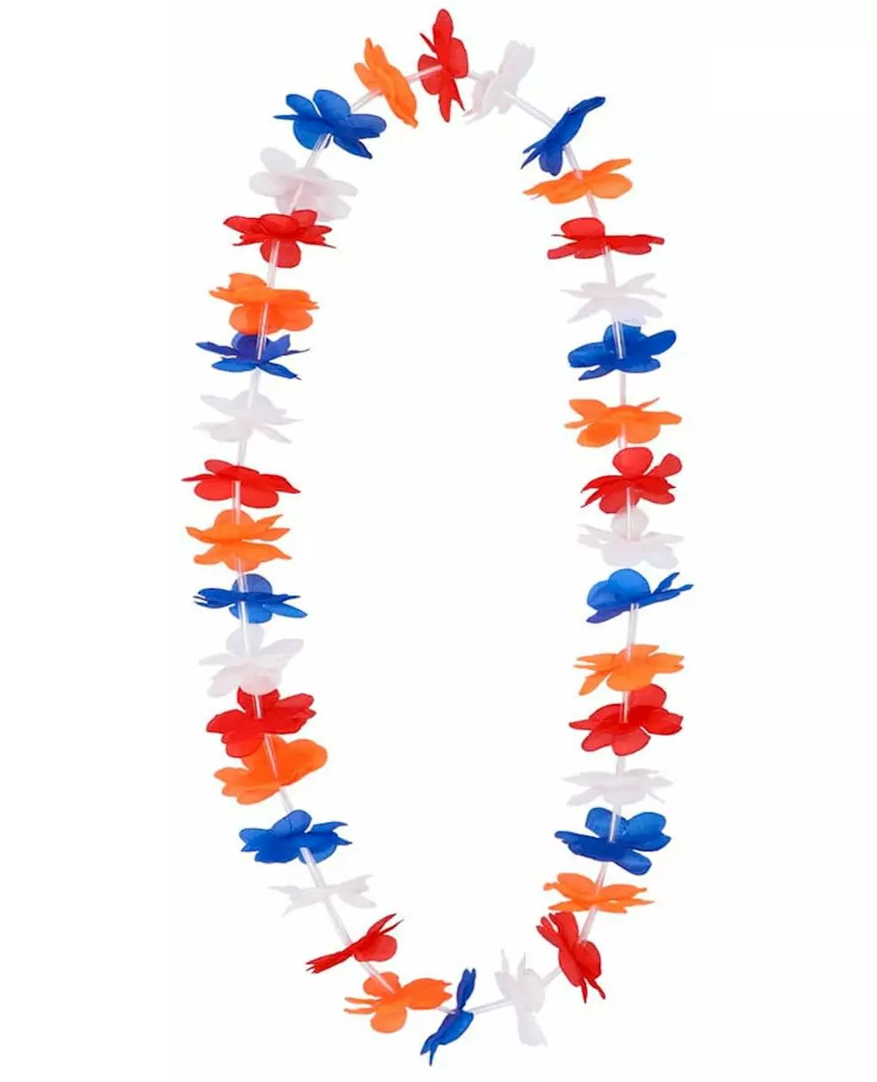 Support your favorite team! This Netherlands supporter Hawaiian necklace is for adults. It is made up of red, white, and blue tricolor fabric flowers. Each colored flower is followed by a small transparent plastic tube that holds the flowers in place. Complete your Dutch supporter outfit with this pretty necklace for your sporting event such as the World Cup or the Euro! Accessories included: 1 Hawaiian Necklace Material: Fabric, plastic Care: Do not wash