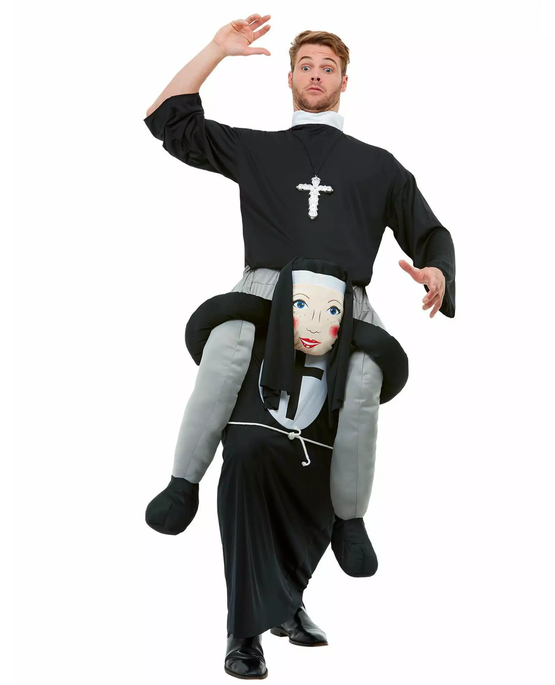 On a nun's back! This men's nun's back costume is for adults and consists of a bottom. The bottom features padded false legs to give the impression of being worn by a nun. The nun wears a black dress with a cross design through which you can put your legs. The top and cross worn by the model are not included in the costume. You can wear a black top and dress up as a priest if you wish for an even funnier effect! Put on this humorous men's nun's back costume to impress your friends. for a theme party! Material: EXCPOLY (100.0%). Accessories included: Costume