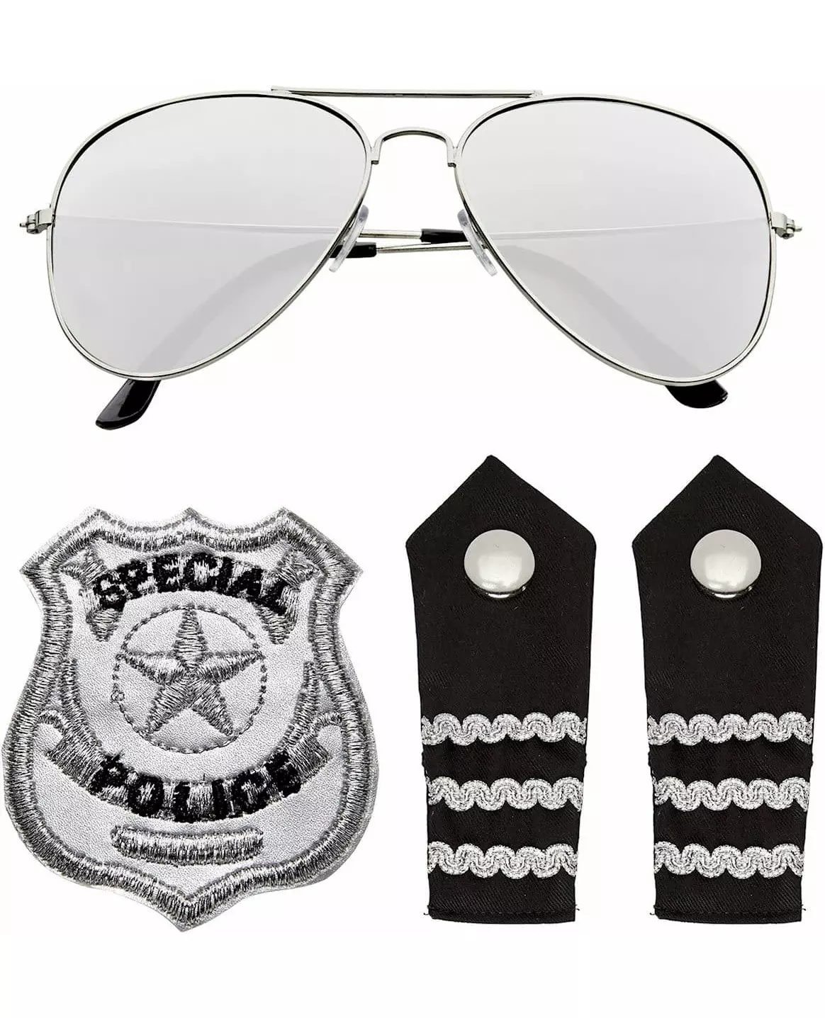 Hands up! This police kit includes silver-framed glasses, black epaulettes with silver trim, and a badge-shaped patch with the words "SPECIAL POLICE". These accessories are perfect for completing a police officer costume for your next fancy dress party. Accessories included: Glasses Epaulettes Badge