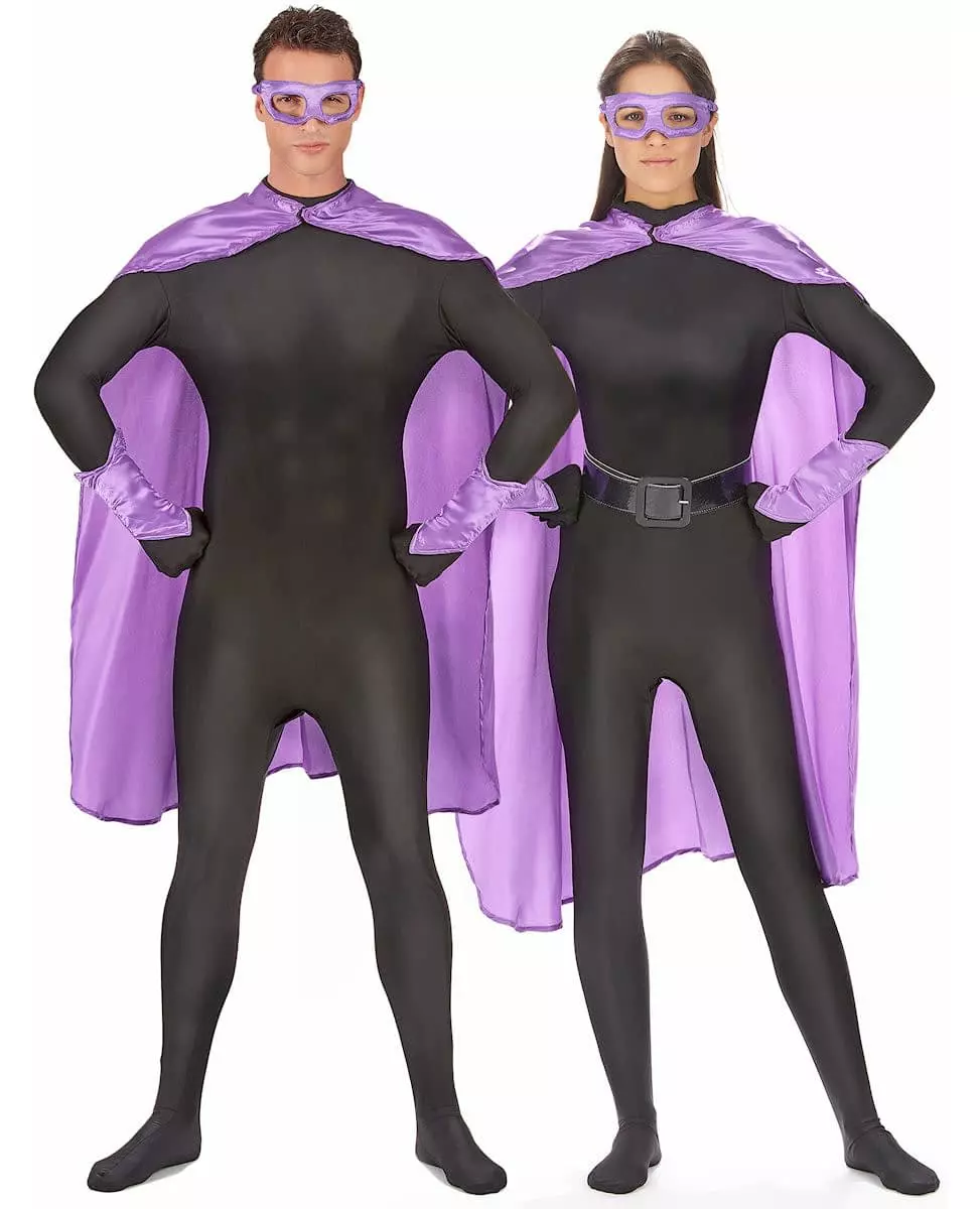 Become a superhero and spread good around you This purple superhero kit for adults consists of a cape, a mask and a pair of cuffs (jumpsuit and belt not included). The long satin cape is purple. It closes at the front with a Velcro fastener. It measures approximately 117 cm in length. The matching mask is held to your face with an elastic band. The cuffs slip easily over your forearms without fastening. This kit will be perfect for transforming yourself into a superhero and doing good around you. Accessories included: Cape Wolf 2 Cuffs Material: 100% Polyester Care: Hand wash