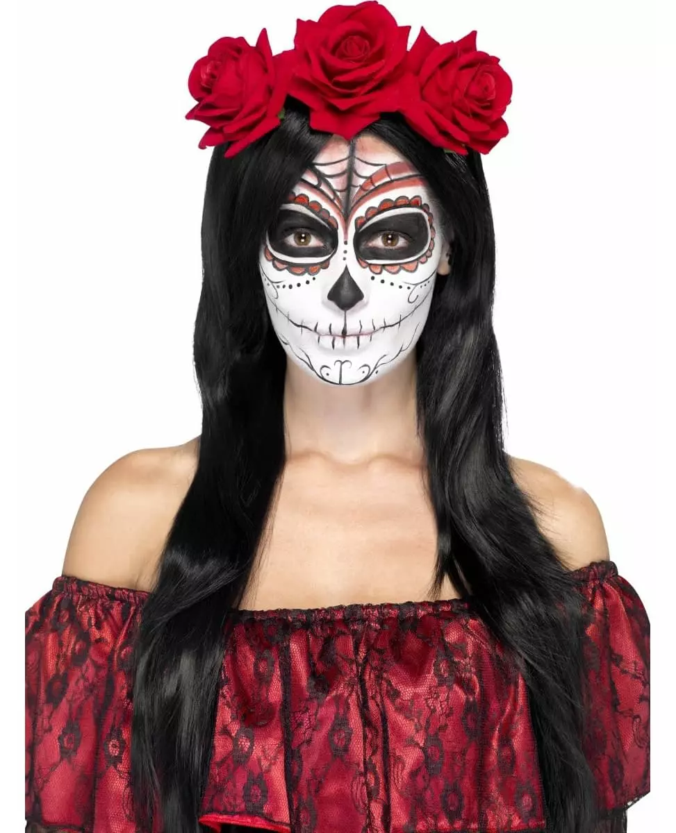 Dare to wear red! This floral headband is for adults. Made of plastic, this black headband is decorated with three large flowers. These large roses are red and will add color to your skeleton outfit. Let your imagination run wild to accessorize your outfits on All Souls' Day. Accessories included: Headband Material: Fabric and plastic