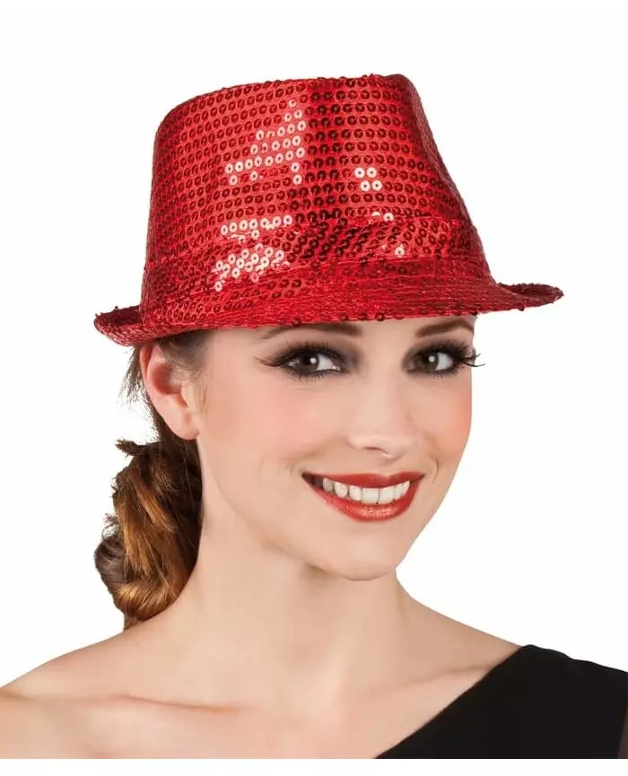 Ideal for shining at a party! This adult borsalino hat is covered in red sequins and has a head circumference of 58cm. It will be the ideal accessory to complete your costume at theme parties. Accessories included: Hat Material: 100% Polyester Care: Hand wash