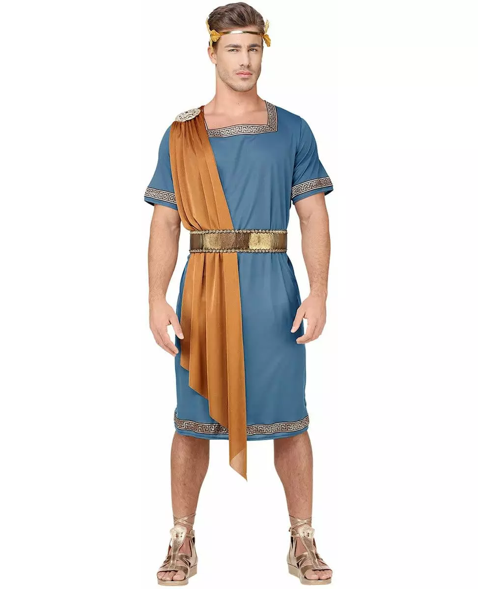 Transform yourself into a superb Roman king in this costume. This Roman king costume for men consists of a tunic, a belt, and a headdress (shoes not included). The tunic is blue with a square neckline. Braids run along the bottom of the tunic, the sleeves, and the collar. A pretty orange drape is present at the shoulder. The belt with metallic reflections will mark the waist. Finally, a headdress completes this costume. It is decorated with fake gold leaves. This costume will be perfect to become the master of ancient Rome for a peplum evening. Accessories included: Tunic Belt Headdress Material: 100% Polyester Care: Hand wash