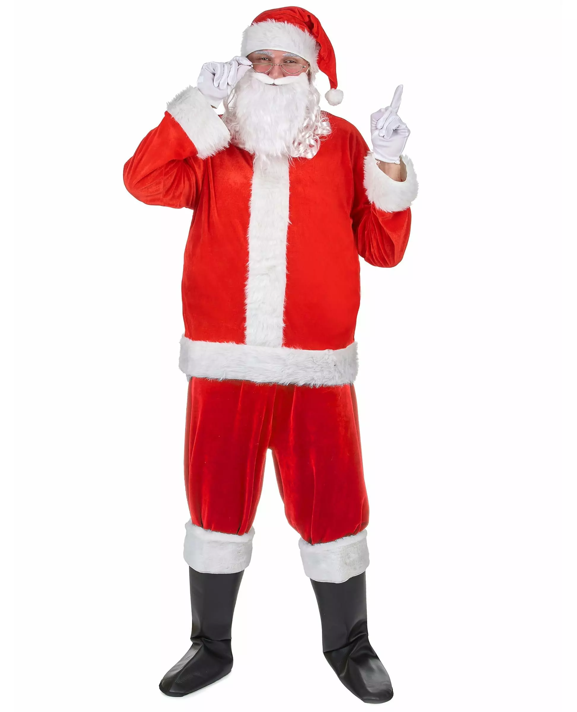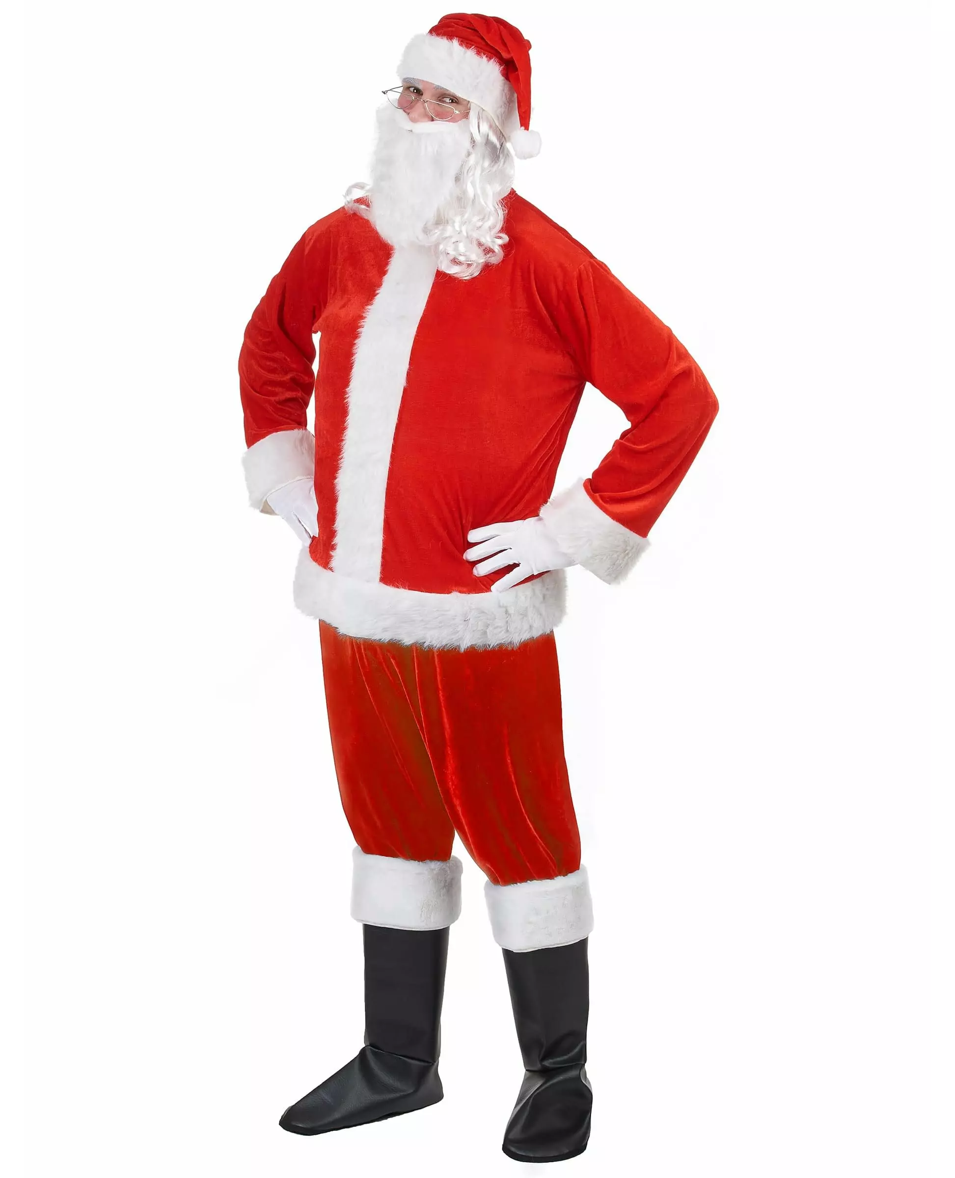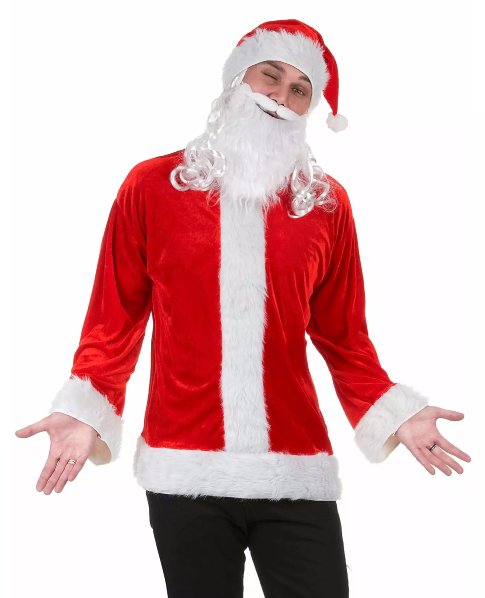 Enough to make a strong impression This Santa Claus kit for adults consists of a top, a hat and a beard (pants, shoes and glasses not included) The long-sleeved top and the hat have a velvety feel. The lapels, the false buttonhole and the bottom of the outfit are made of white synthetic fur. The beard is made of white synthetic hair and is attached to the face with an elastic band. The top of your face will be surrounded by white fake hair sewn directly to the hat. This Santa Claus set will be perfect for playing the role of children's most beloved character with sobriety. Accessories included: Top Beard Cap Material: 100% Polyester 100% Polyester 100% Polyester 100% Polyester