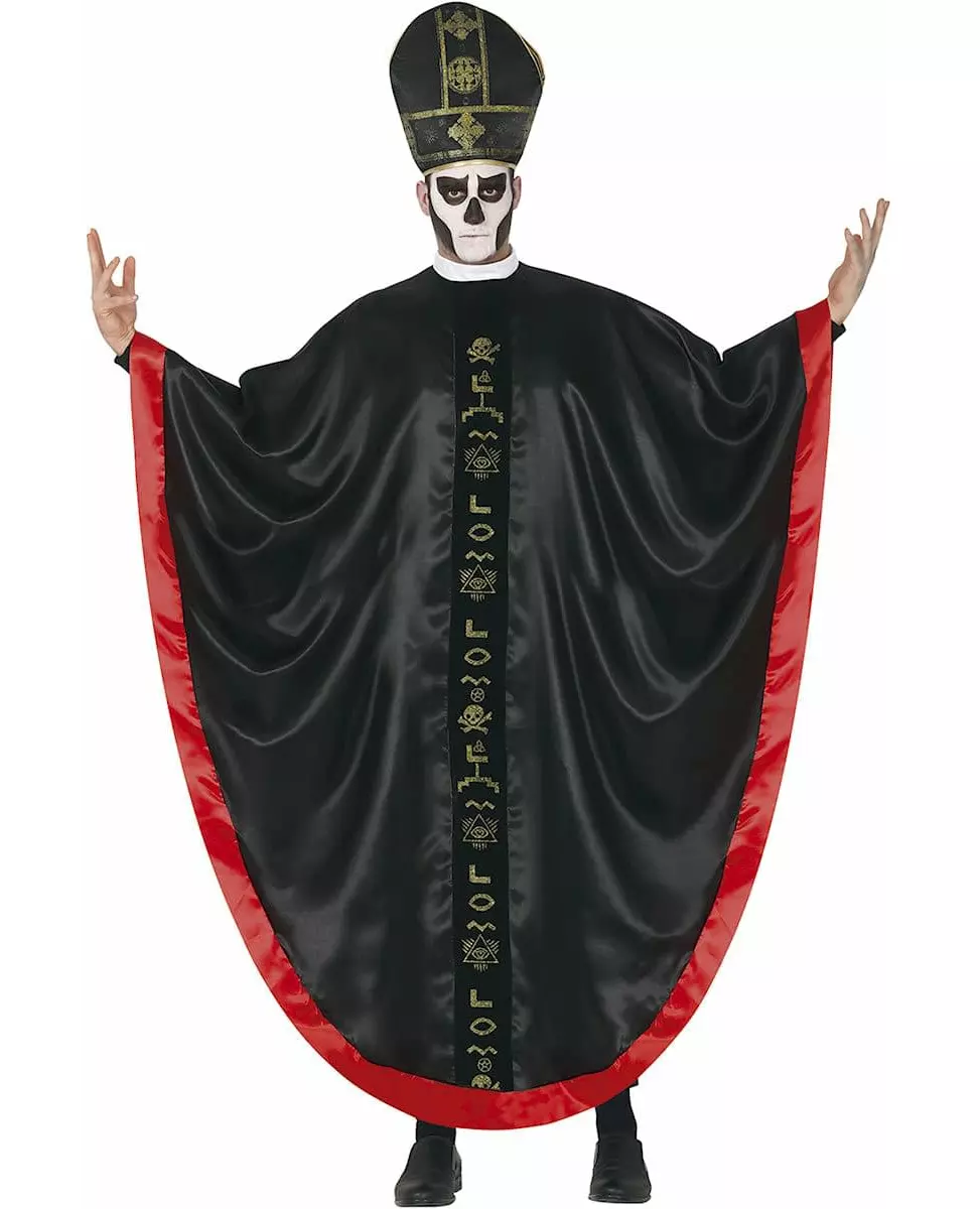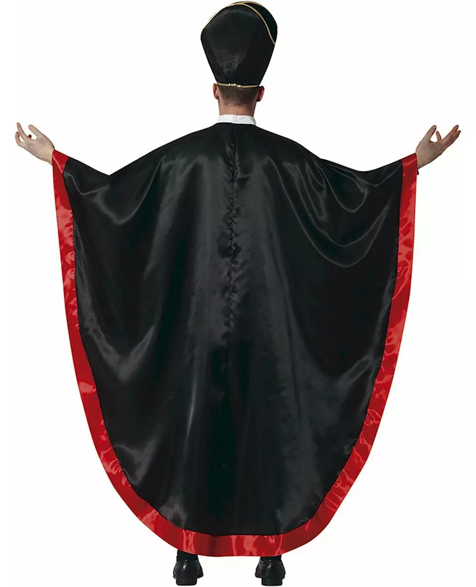 Sacrilege! A Satanic Cardinal! This Satanic Cardinal costume is for adults. It consists of a tunic and a headdress (makeup and shoes not included). The tunic is very long and entirely black with a vertical frieze printed with golden symbols. The texture of the tunic is satiny and gives this noble appearance to the costume. A high white collar echoes that of the Church codes for more realism. The headdress is high and all black with golden symbols. Wear the costume of a man of Satanic religion to shock your friends during your costume party! Accessories included: Tunic Headdress Material: Polyester Care: Hand wash