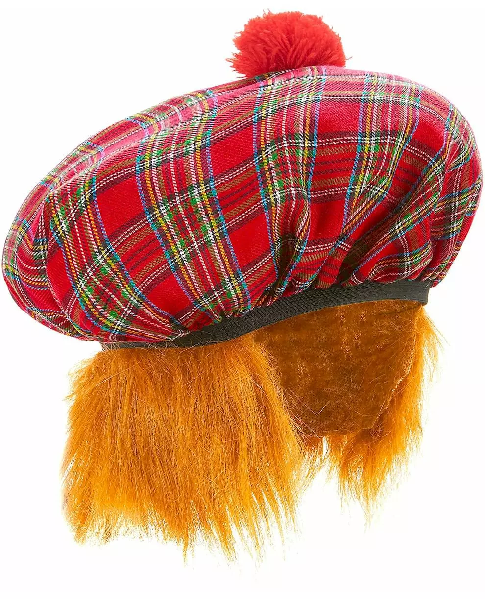 With the red pompom! This Scottish beret for adults is red and green checked. It has synthetic red hair on the sides. It is the ideal accessory to complete Scottish costumes at themed events, especially during Carnival. Accessories included: Beret with hair Material: 100% Polyester 100% Polyester