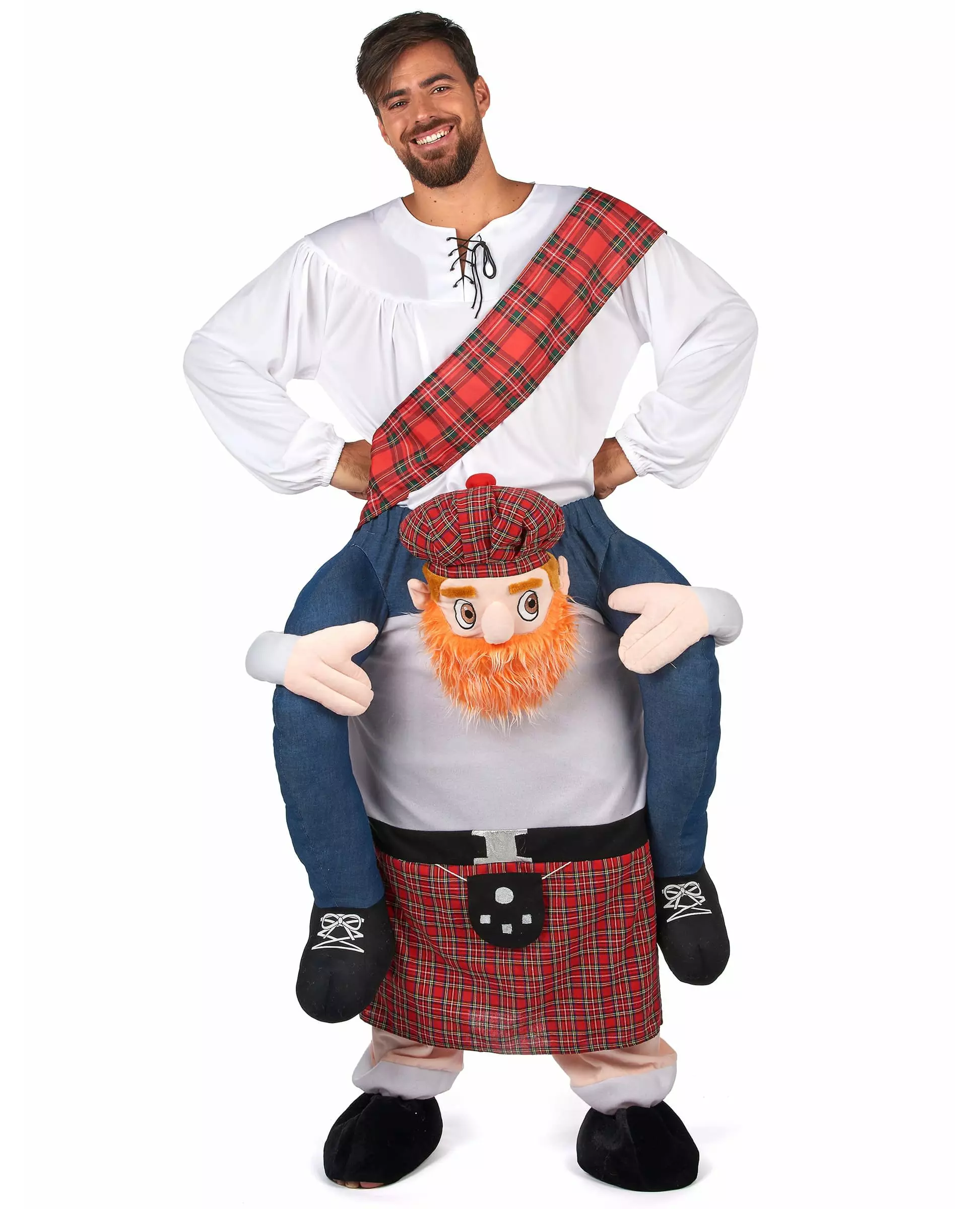 Kilt Racing! This carry me is a man-on-the-back Scottish costume for adults. This humorous costume is a pair of trousers that adjust to your size using a drawstring. This costume also has false legs, dressed in denim-effect trousers, which are padded to give the illusion of being worn. by a Scotsman. The Scotsman has a red beard and wears the traditional red checkered kilt! This carry me will be perfect to impress your friends and demonstrate your strength at costume parties such as carnival or for a fancy dress race!. Accessories included: "Carry me" pants Material: 100% Polyester Care: Hand wash