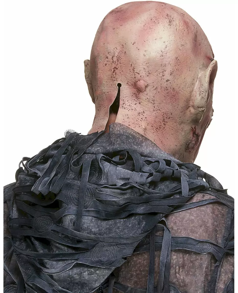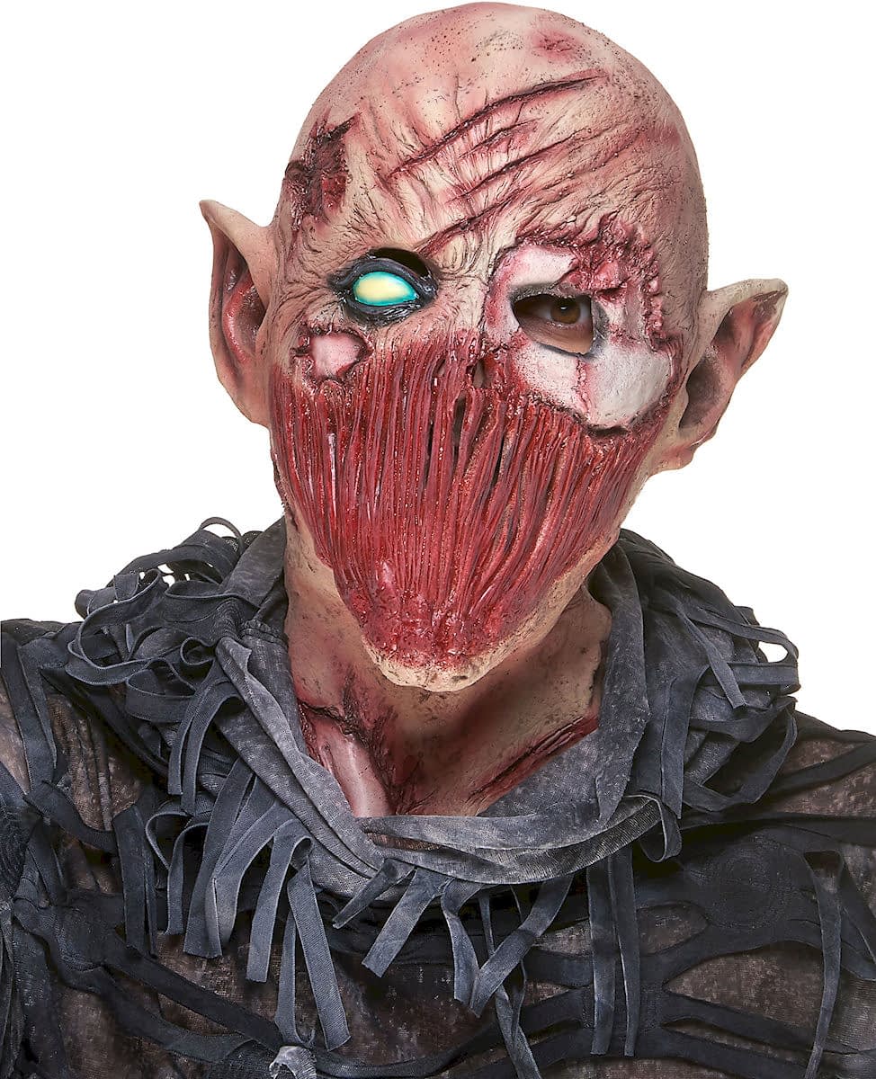 No smiling allowed! This full-face mask for adults is made of latex and represents a screaming demon with a largely flayed lower face. Its white eye surrounded by green only makes it more frightening. It is worn like a hood and is pierced at the eyes and ears for your comfort. For a spooky Halloween evening, this mask is sure to scare more than one person around you!. Accessories included: Mask Material: 100% Latex