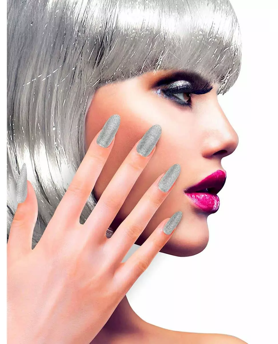 perfect glittery look! These 12 silver false nails are self-adhesive. They are glittery and long with a rounded tip. These false nails will be essential for creating a total silver look for your disco party! © Copyright Widmann SRL. Accessories included: 12 Self-adhesive false nails