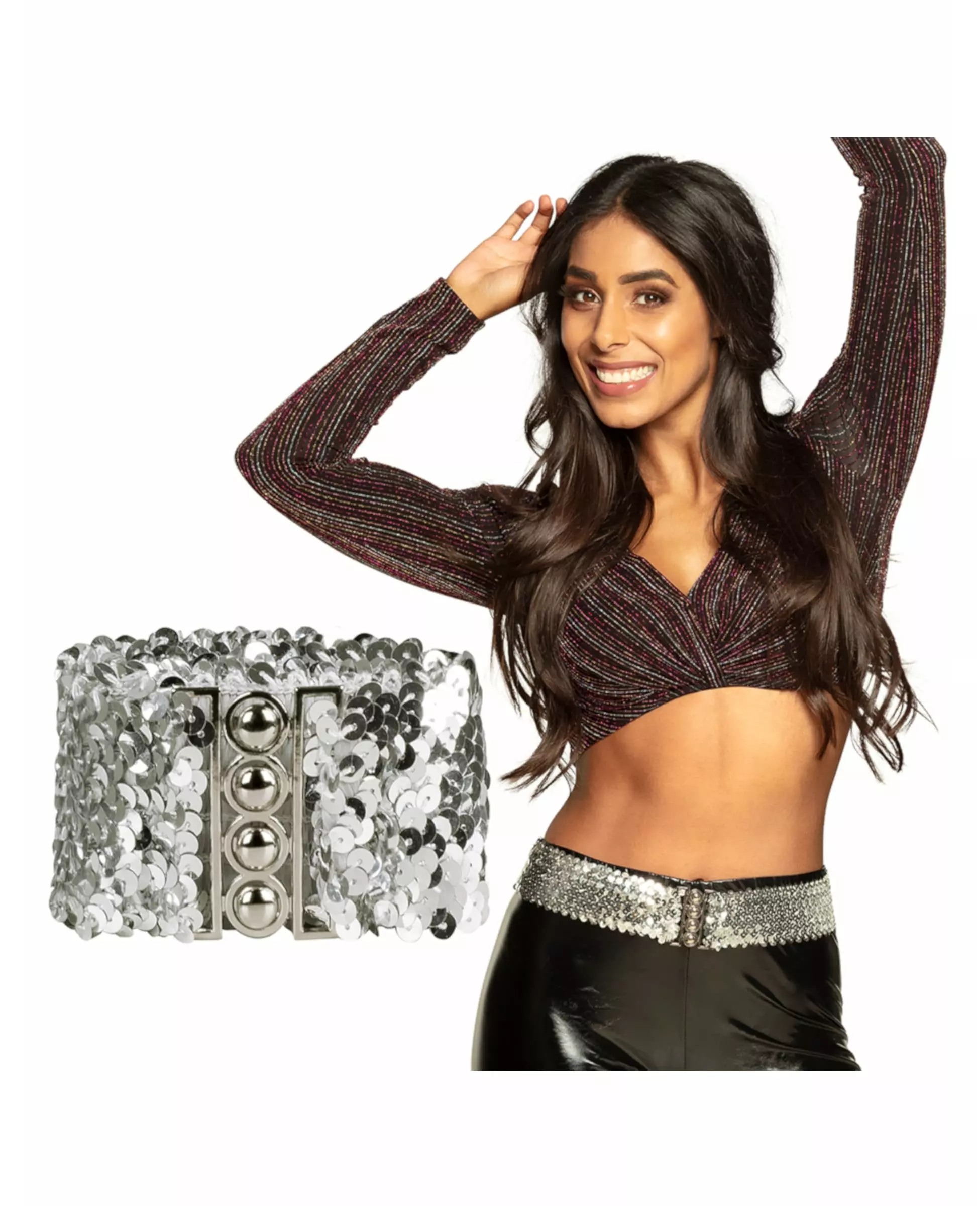 Add some sparkle to your disco outfit This shiny belt is for adults. Elastic, it is decorated with silver sequins along the entire length. It closes with a large metal hook. This belt will perfectly complete a disco costume for an 80s party. Accessories included: Belt Material: 55% polyester, 25% PVC, 10% elastane, 10% iron Care: Hand wash