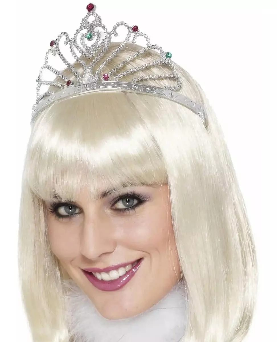 With precious stones! Beautiful silver-colored adult tiara encrusted with faux precious stones.