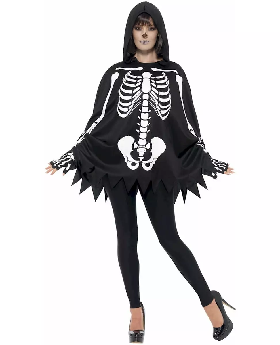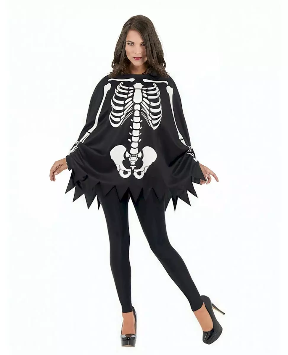 Dress up quickly as a skeleton with this cute poncho! This Skeleton Poncho for adults consists of just a poncho. It is black in color, with bone prints, forming the upper body of a skeleton. It is characterized by its pointed cut on the lower part. This poncho will be perfect for quickly changing into a skeleton on Halloween night! Accessories included: Poncho Material: 100% Polyester Care: Hand wash