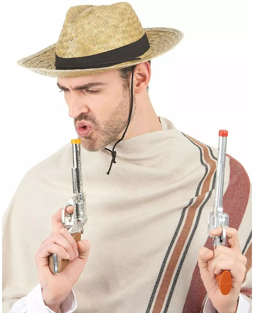 The trigger ace! This cowboy hat is for adults. It is made of braided straw in a natural color. The headband is encircled with a band of black fabric, and an adjustable cord is attached to the headgear. It will fit head circumferences close to 56 cm. It will be the essential complement to a cowboy costume for Carnival or any other fancy dress event. Accessories included: Hat Material: Straw