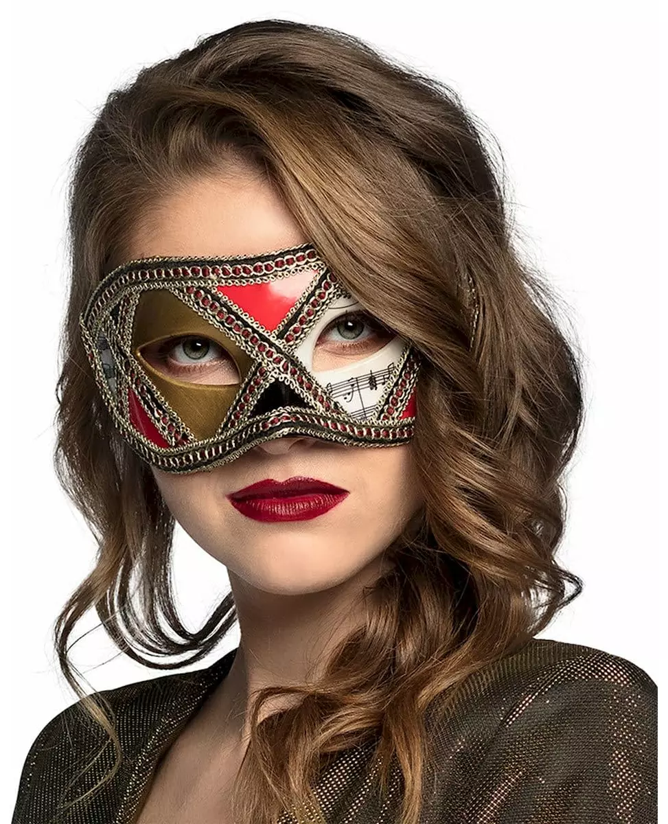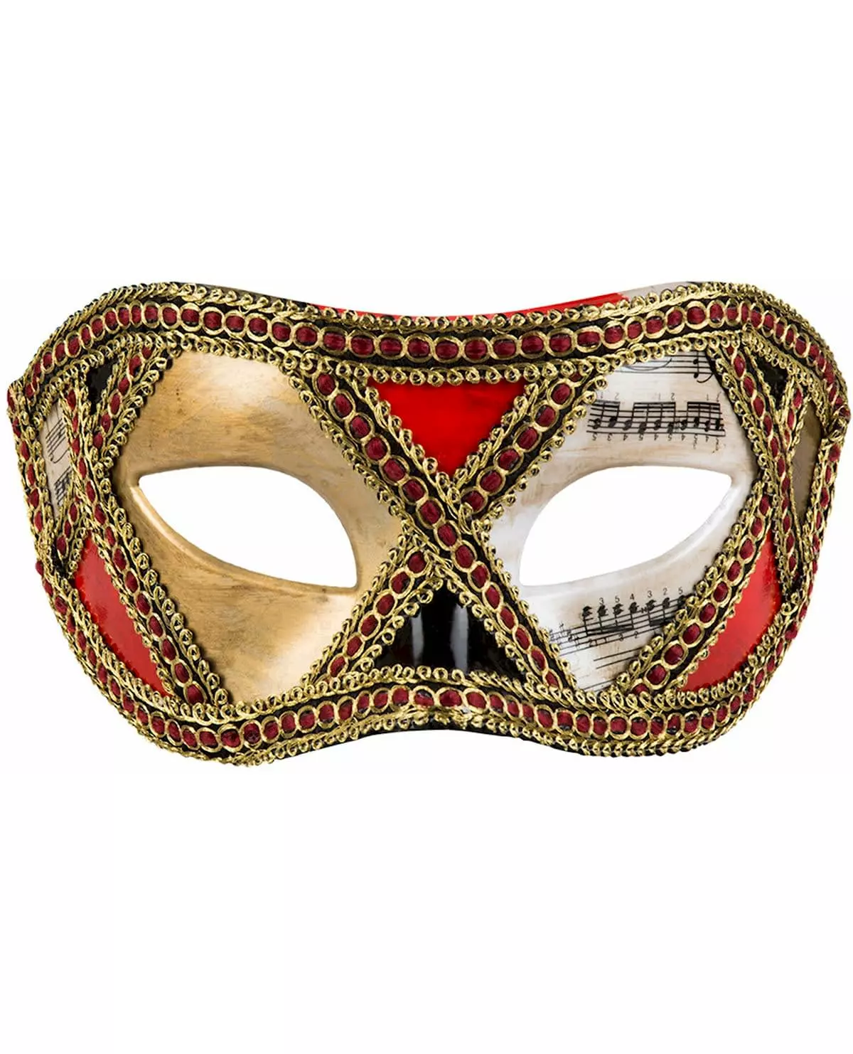 Complete your costume with this pretty mask! This Venetian mask for adults is decorated with gold, red and black patterns as well as musical notes. A gold and red border highlights the entire outline of the mask. Black ties are tied behind the head and ensure the mask stays securely on your face. This accessory will be ideal to complete a costume for a Venice Carnival-themed evening. Accessories included: Mask,