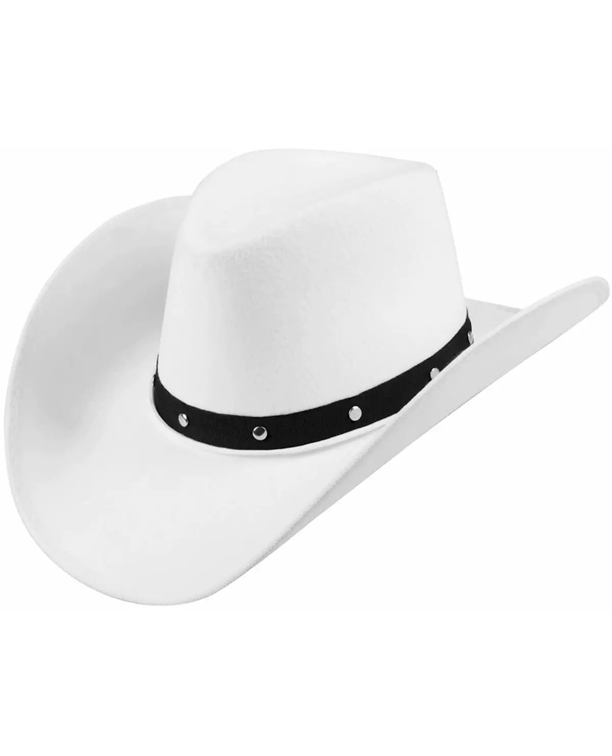 Yiiiii Haaaaaa! This hat is for adults. Entirely white and made of felt, it is adorned with a black border embellished with silver metal details. A white cord allows it to be held on the head since it can be adjusted around the neck as you wish! The headgear fits a head circumference of 61 cm. Ideal for completing a cowboy costume during a Wild West-themed evening!. Accessories included: Hat Material: 100% polyester Care: Hand wash