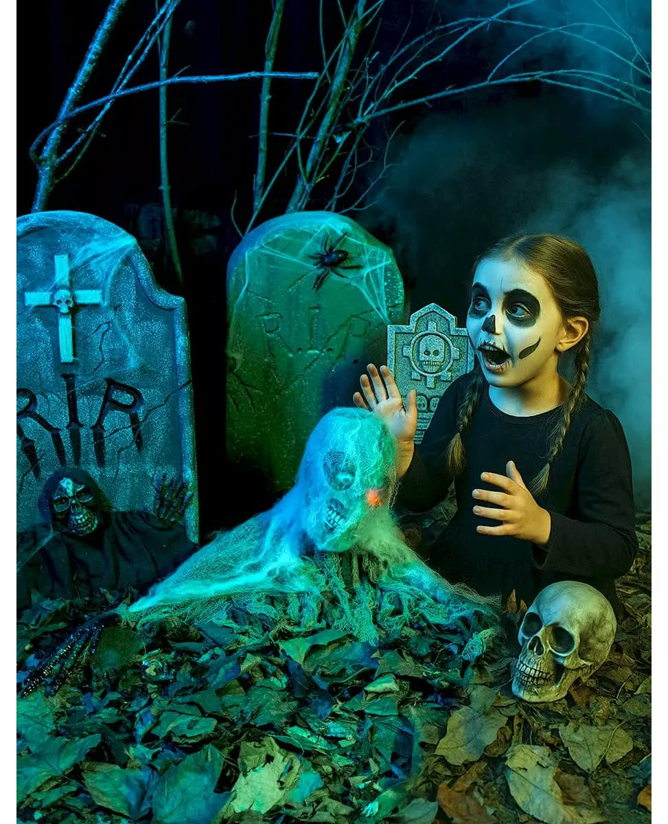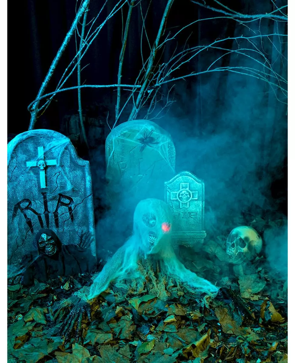 Have you ever seen a zombie come back to life? This animated decoration features a zombie's head and arms. The lightweight skull is covered in veils and fake white spider webs. The zombie has only one eye. In place of the missing eye is a small LED. The arms are thin, moldable rods covered in gray and beige fabric and a fake white spider web. This zombie's hands are hollow, made of soft plastic. A battery-operated mechanism is located on the back of the decoration (batteries not included). Simply press the button and the zombie's head and arms will start moving. At the same time, the eye will light up red and the undead will sneer. After a few seconds, the decoration will stop, and you just have to press the button again to bring this zombie back to life. This decoration measures approximately 32 cm in height and can measure up to 120 cm in width. This decoration will be perfect for scaring your guests on Halloween. Accessories included: Animated decoration Material: 20% Wire - 20% Paper - 50% Plastic (polyethylene) - 10% Polyester