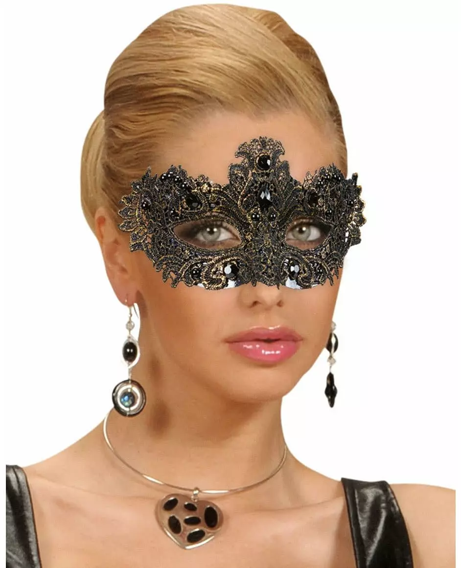 Lace and glamour to seduce... This mask is black and gold. Measuring 24 x 10 cm, it is made of plastic covered with lace and adapts perfectly to the contours of the face. Its gold details and black lace blend perfectly with the black rhinestones and pearls that chicly decorate the mask. It is held in place with a ribbon to tie on the back of the head. Let your eyes speak at your costume parties and seduce with all your charm in your ball outfit... © Copyright Widmann SRL Material: Plastic - lace,