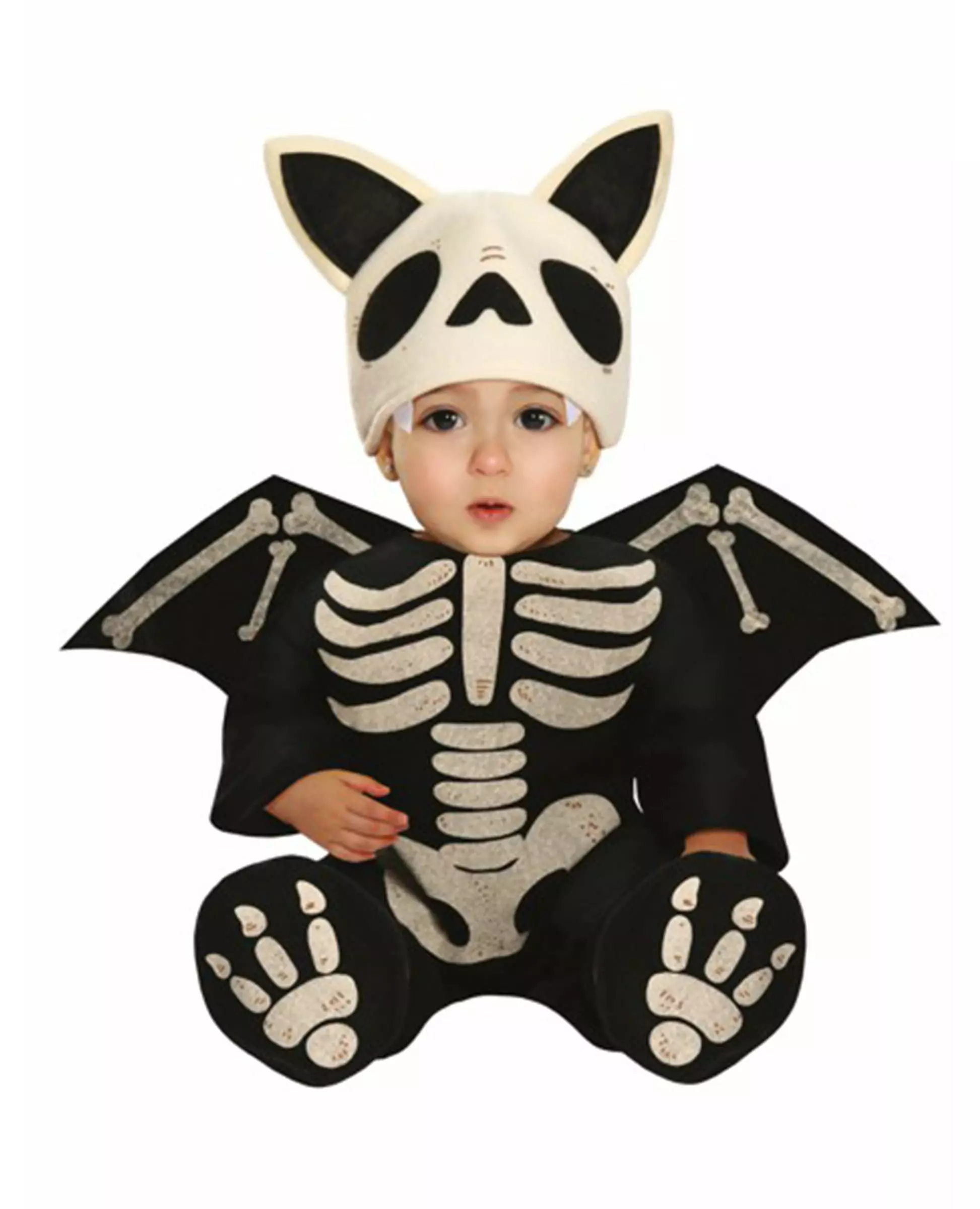 Your little one will be the cutest in this baby bat skeleton costume! This baby bat skeleton costume is for babies. It includes the jumpsuit and the hat. The outfit is black with white patterns that mimic the bones of the bat. All you need is the hat in the shape of a bat skull, with its little ears, to look like a real terror of the night! This baby bat skeleton outfit will be perfect for your baby's first night. Material: 100% POLIESTER. Accessories included: Hat Jumpsuit Care: Hand wash