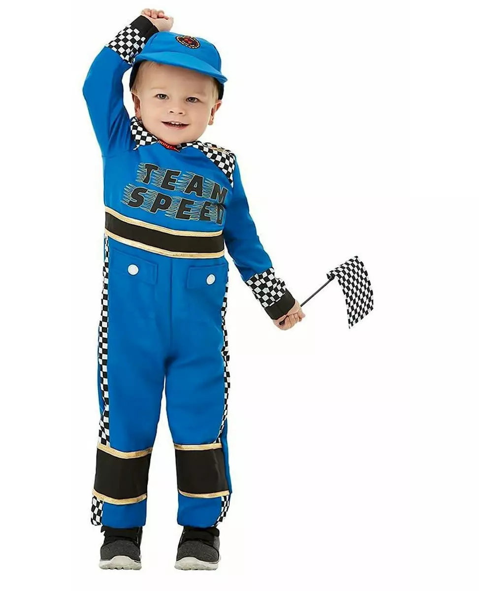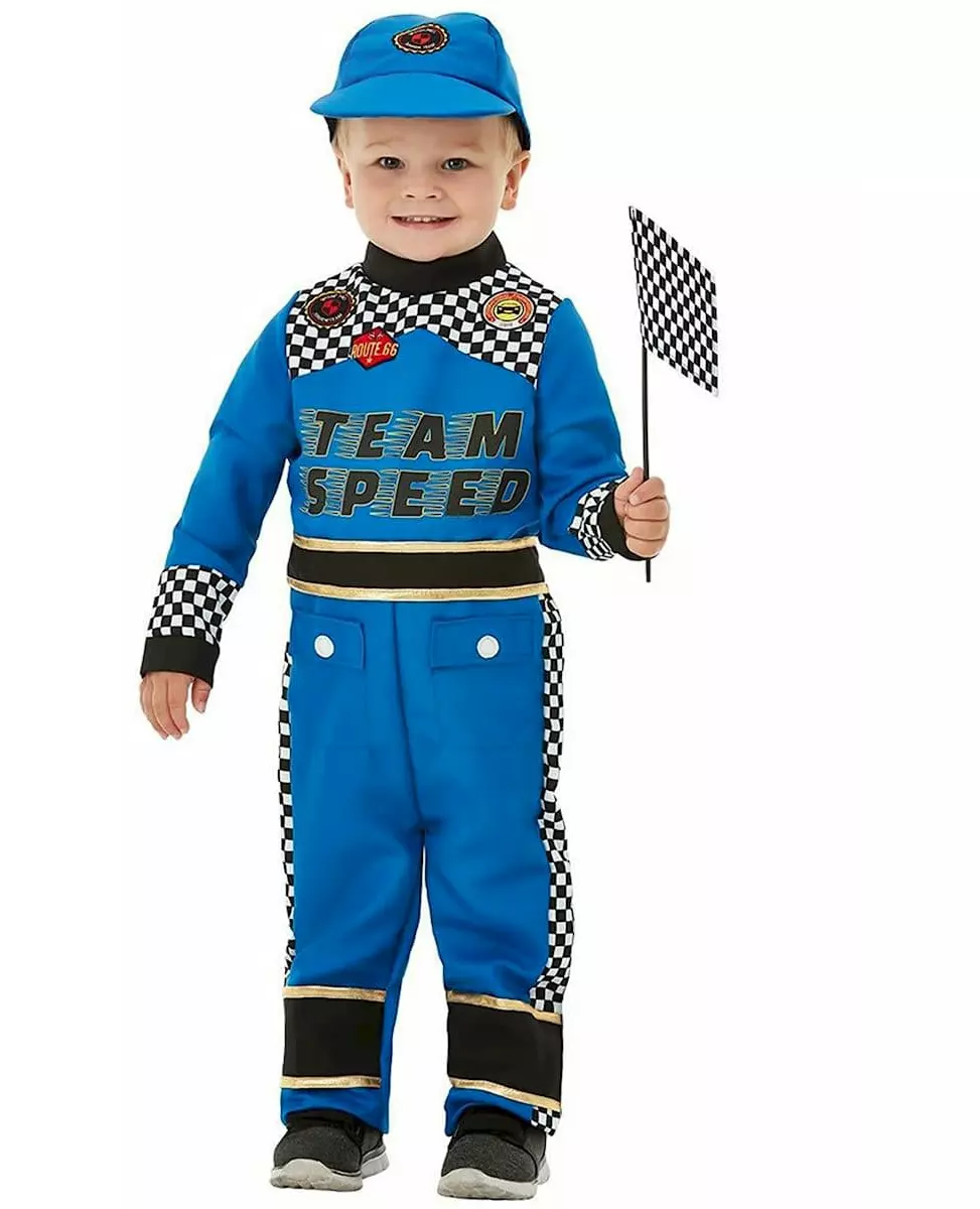 A real driver! This racing car driver costume for babies consists of a jumpsuit, a cap, and a small flag. The long-sleeved jumpsuit is blue. On the front of this jumpsuit, you will find the words "team speed." To complete this outfit, you will find a cap that matches the jumpsuit and a racing flag. This costume will be perfect for dressing your baby as a racing car driver for Carnival! Accessories included: Jumpsuit Cap Flag Material: 100% polyester Care: Hand wash