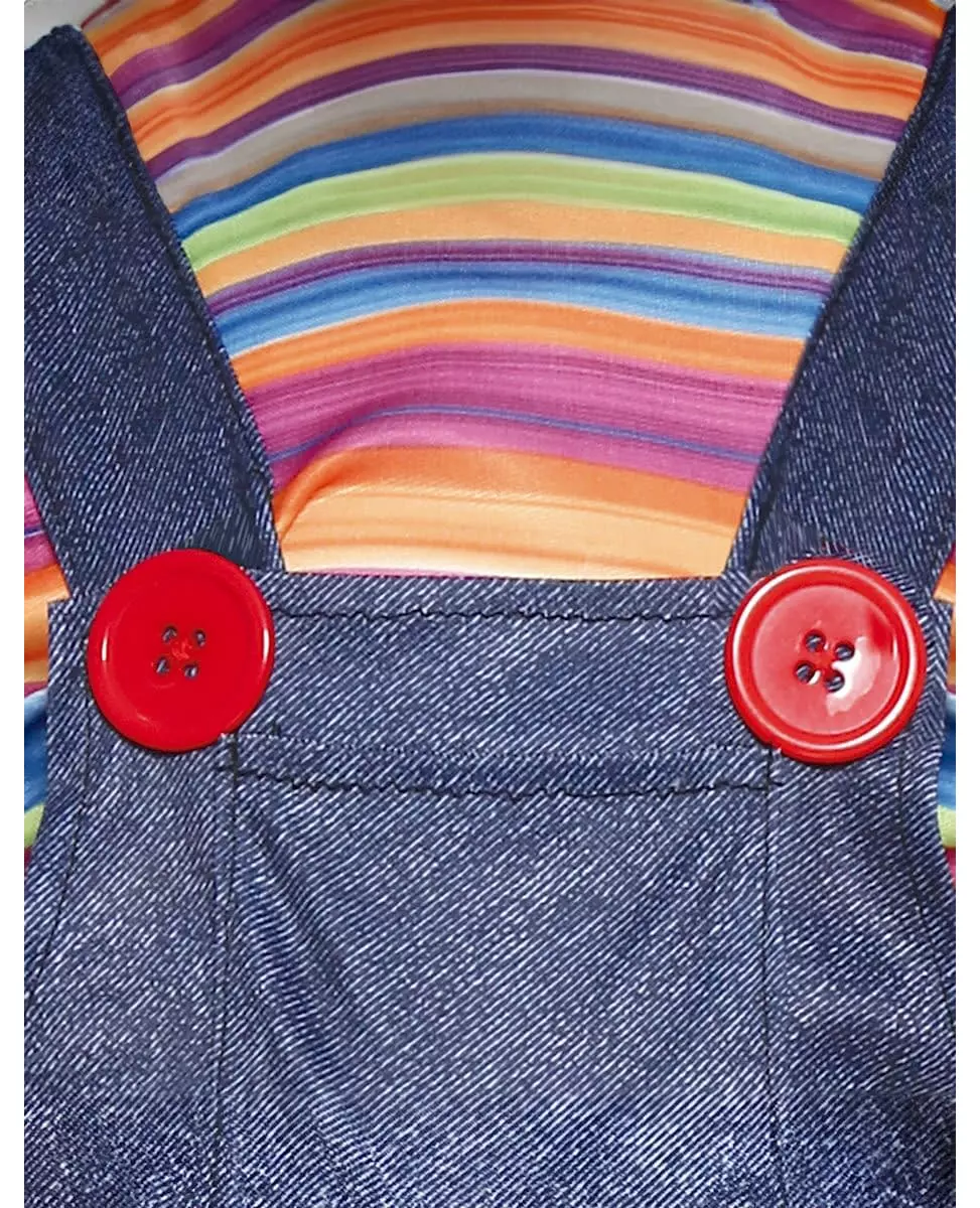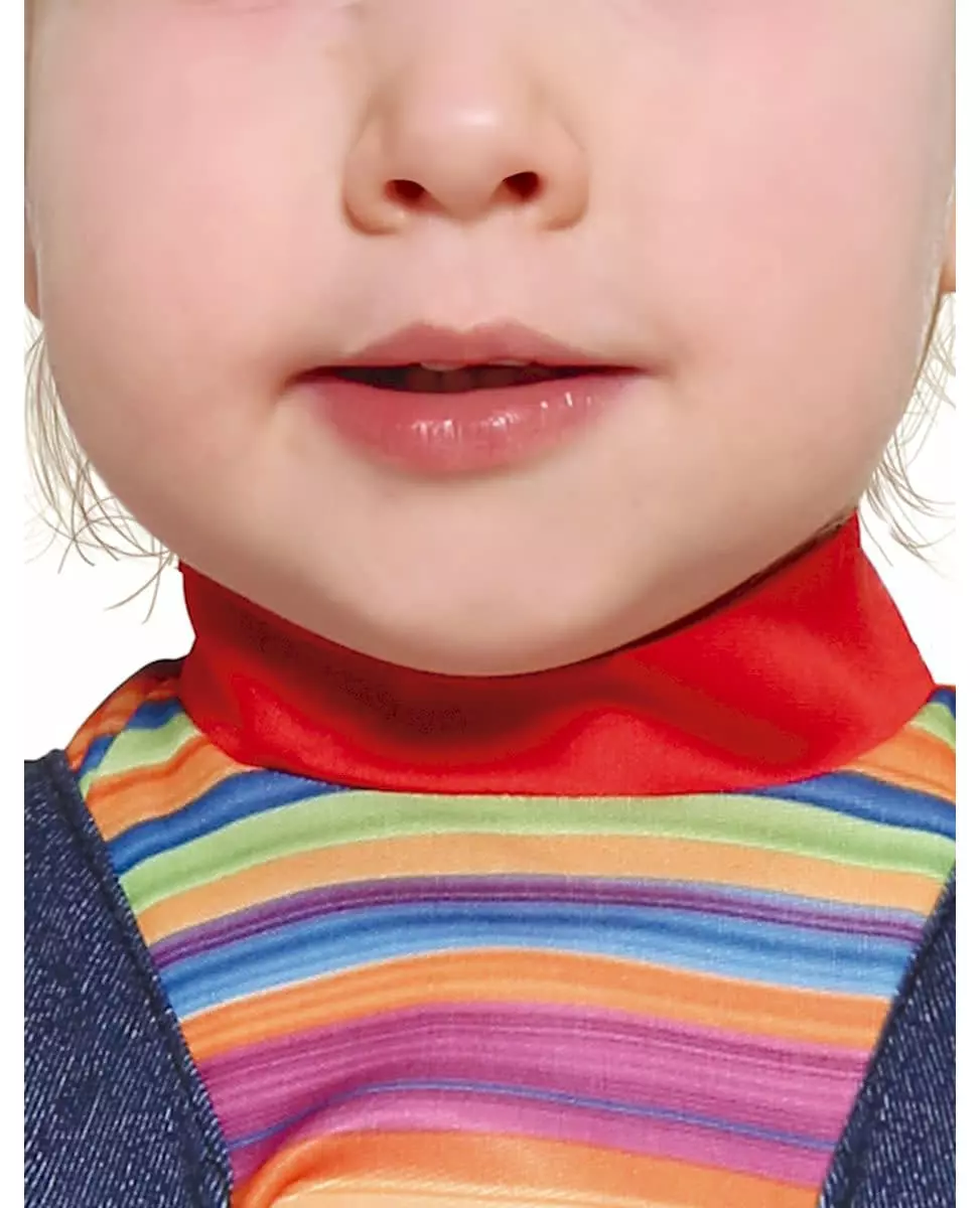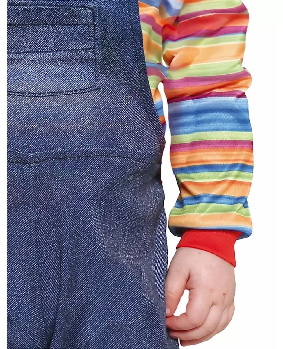 The real devil doll is here! This devil doll costume is for babies. It includes overalls and a top. The baby's costume is represented by overalls with a bluish tint throughout. It contains two large red buttons and a fake central pocket. Underneath, a multicolored top will be added with red sleeves and a red collar as well. This baby costume will be ideal for a costume party on the theme of famous horror films! Accessories included: 1 overall 1 top Material: Polyester Care: Hand wash